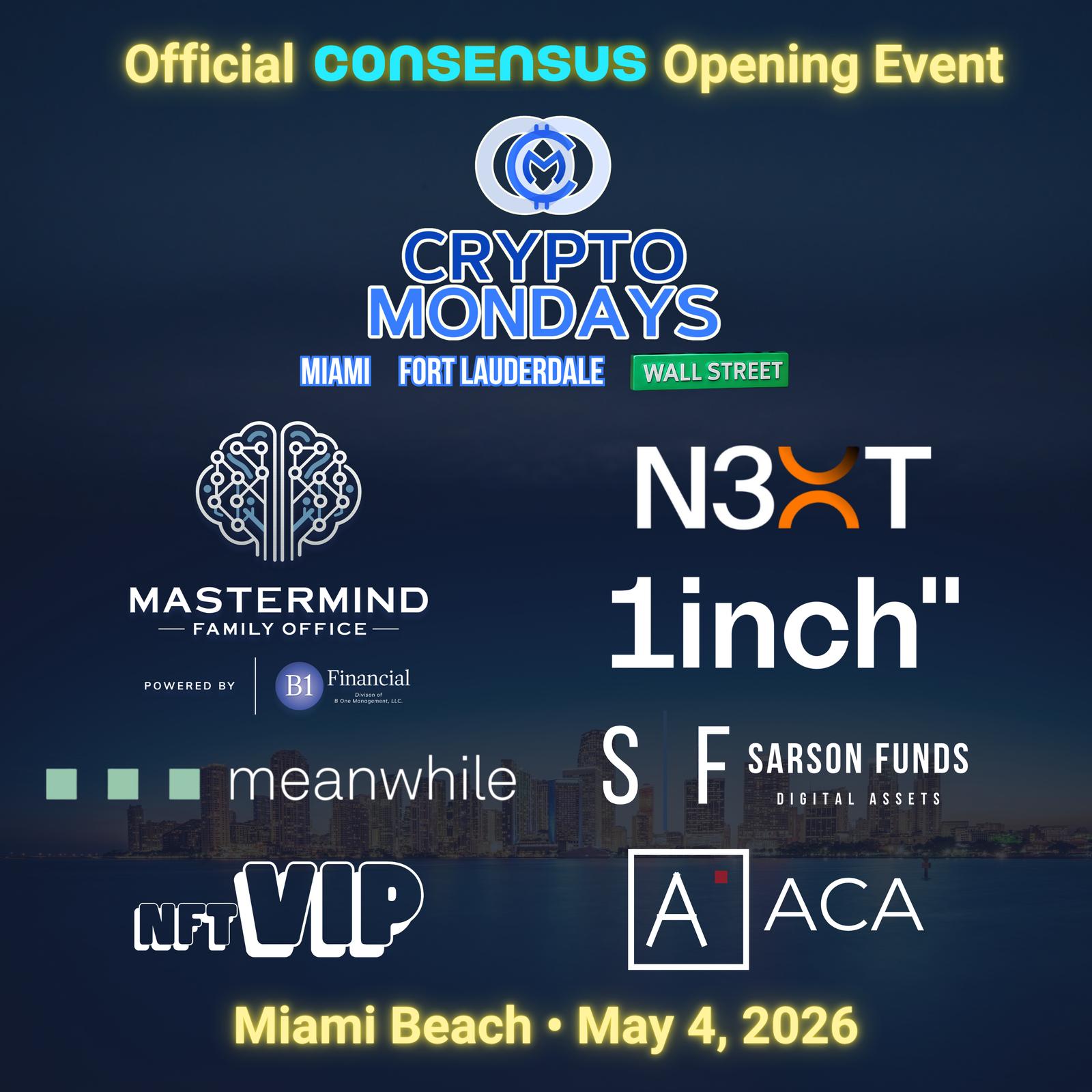 Official opening event of Consensus 2026, hosted by American Crypto Academy and CryptoMondays Miami, Fort Lauderdale, and Wall Street.