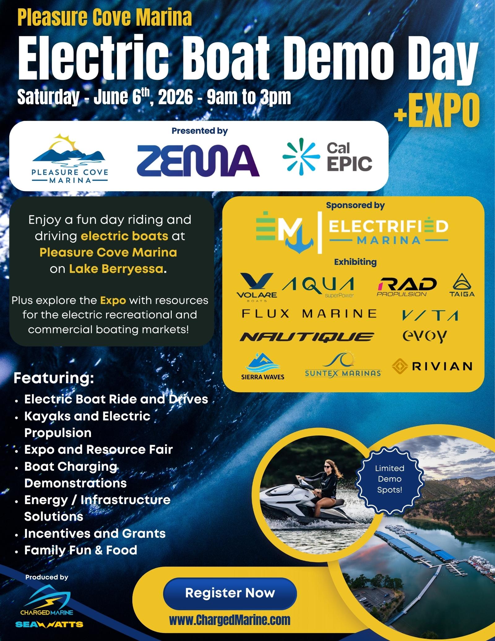 Join us at Pleasure Cove Marina on Lake Berryessa for a fun day of driving and riding in electric boats. Plus explore the Expo with resources for the recreational and commercial boating markets!