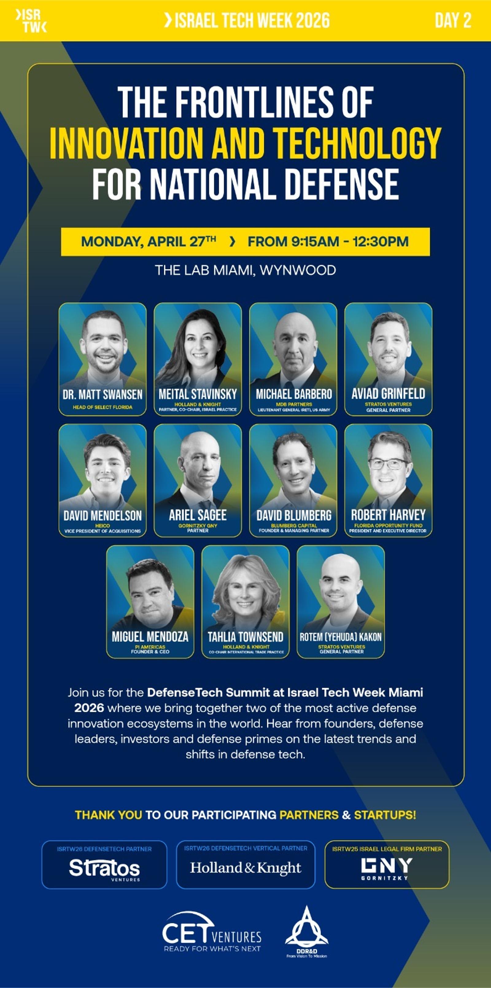 Join us for the DefenseTech Summit at Israel Tech Week Miami 2026, where founders, defense leaders, investors, and defense primes will explore how dual-use technologies, AI, autonomy, mission systems, and resilience platforms are shaping the future of national security and infrastructure.