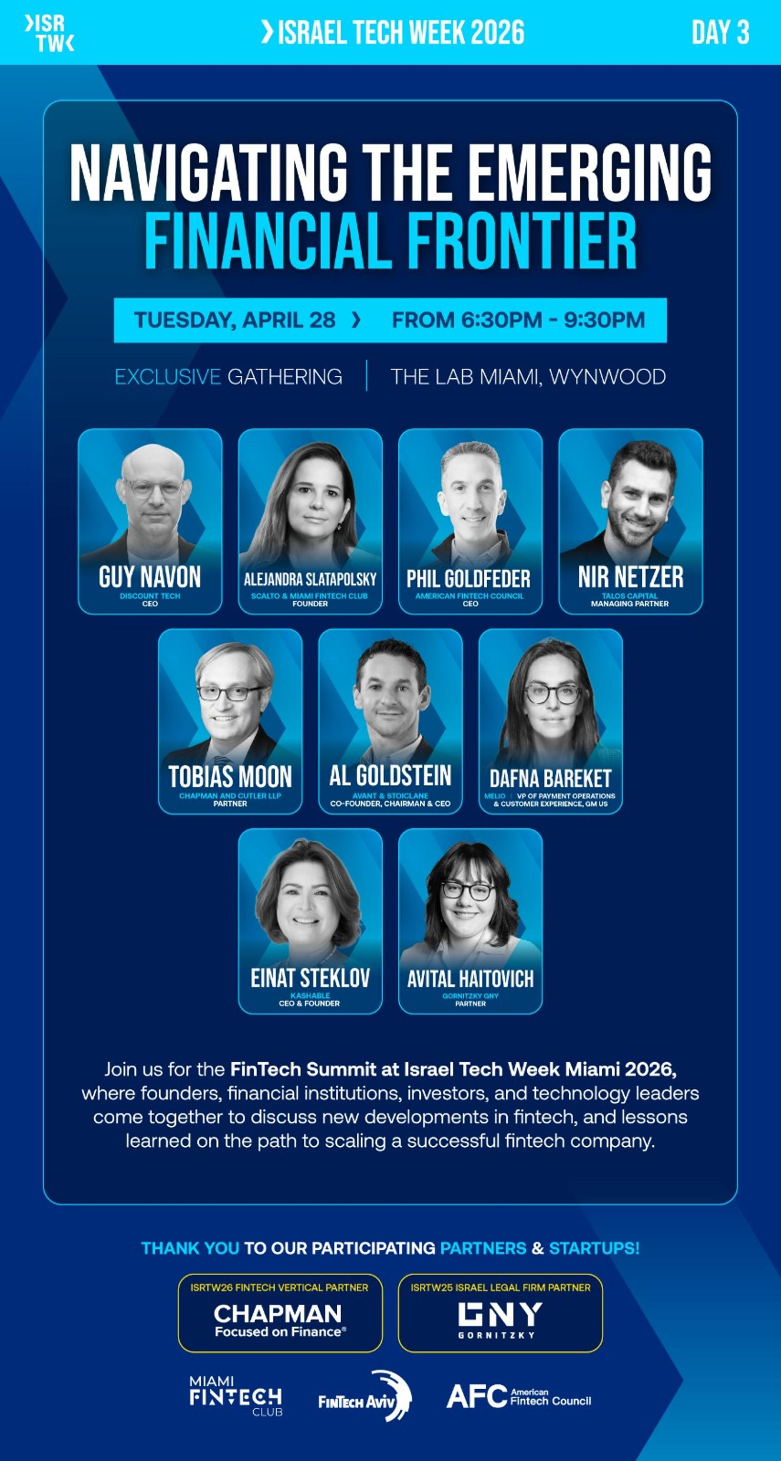 βJoin us for the FinTech Summit at Israel Tech Week Miami 2026, where founders, financial institutions, investors, and technology leaders come together to discuss new developments in fintech, and lessons learned on the path to scaling a successful fintech company.