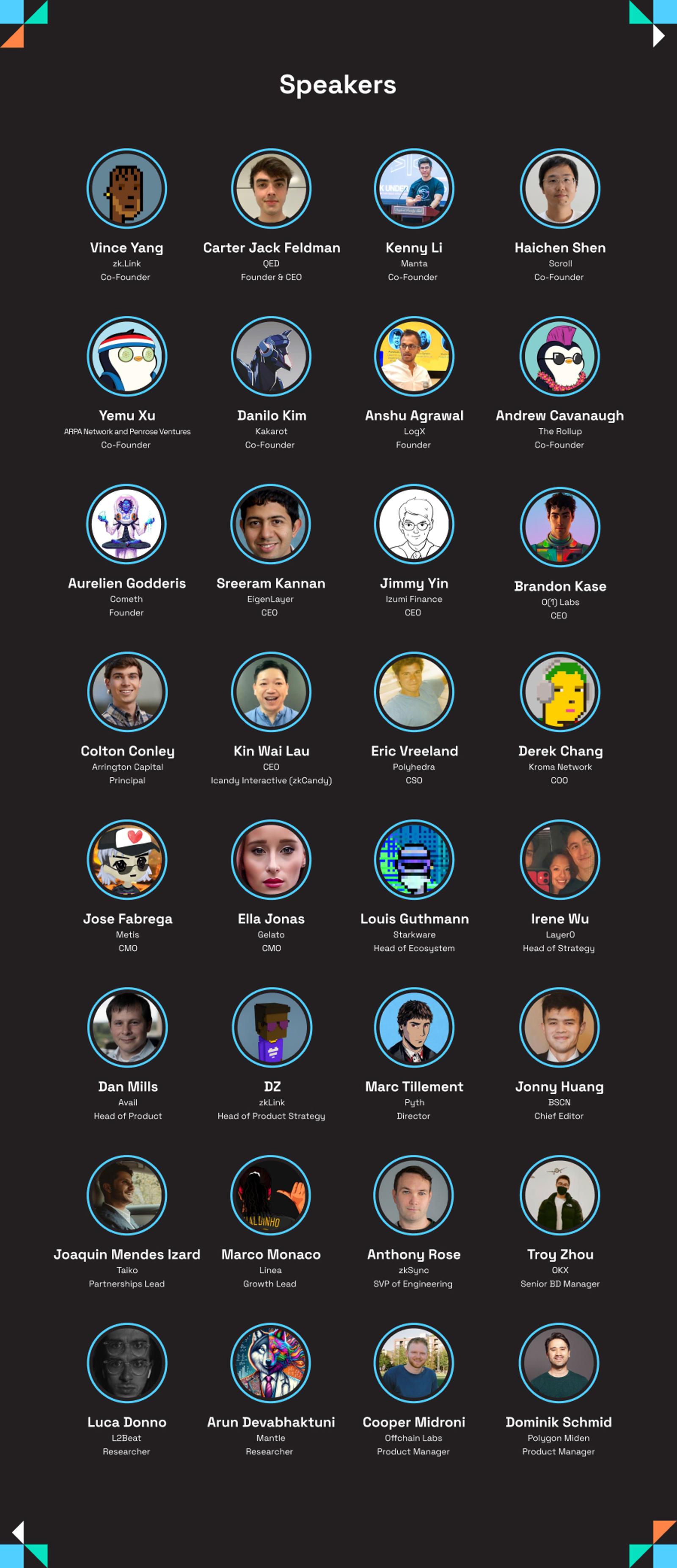 The L3 Summit brings together the world's best protocols such as zkSync, Starknet, Scroll, Linea, Polygon, Manta, Mantle, Kakarot, Taiko, Celestia, Eigen Layer, and more..., to push forward the boundaries of Layer 3 innovation and break through the blockchain trilemma.