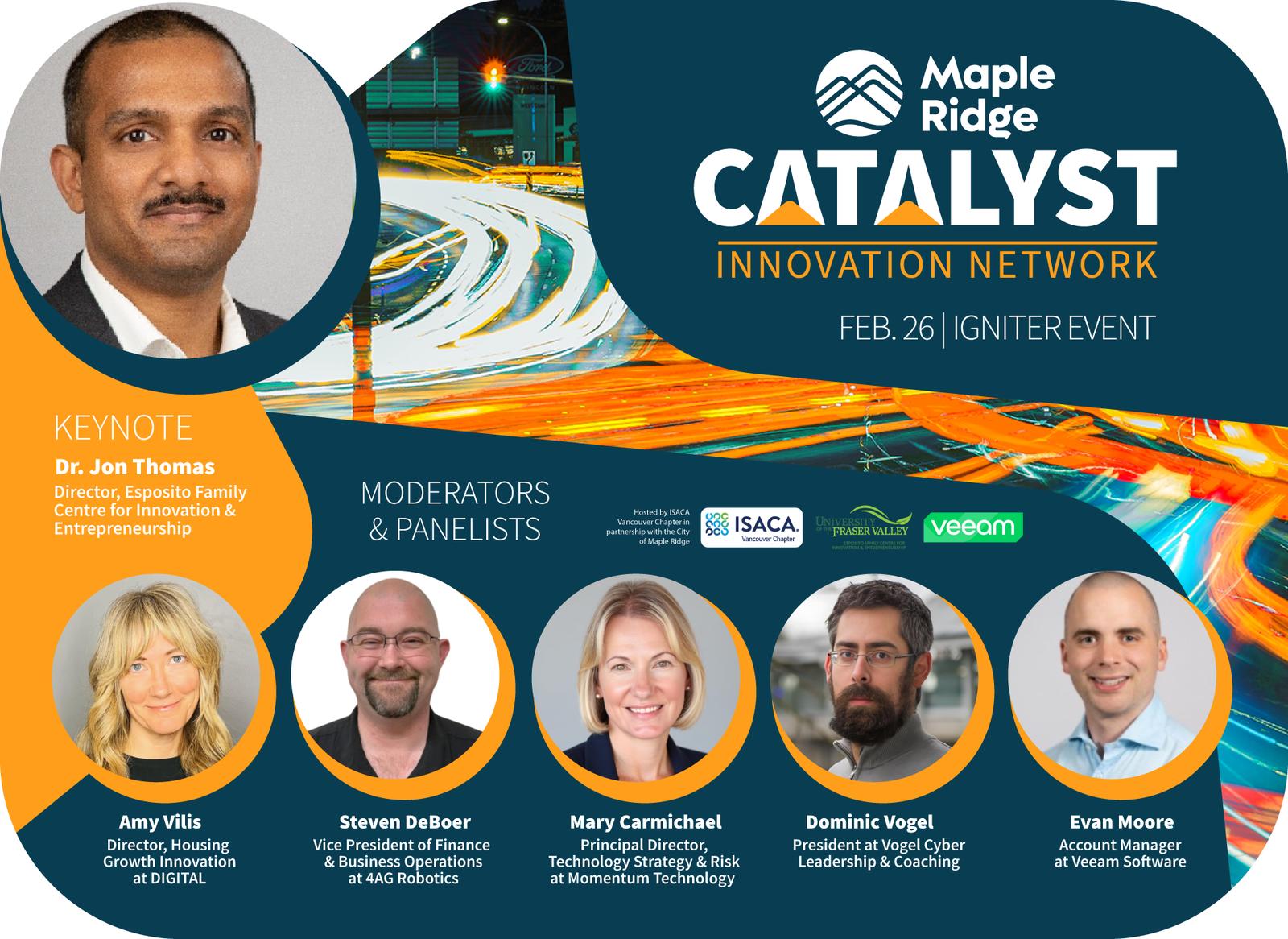Hosted by ISACA Vancouver Chapter in partnership with the City of Maple Ridge, this event brings together entrepreneurs, technology companies, educators, industry partners, government leaders, and community innovators for an evening of learning, networking, and forward-thinking conversations. Enjoy exclusive networking, refreshments, and a keynote from Dr. Jon Thomas of UFV’s School of Business.