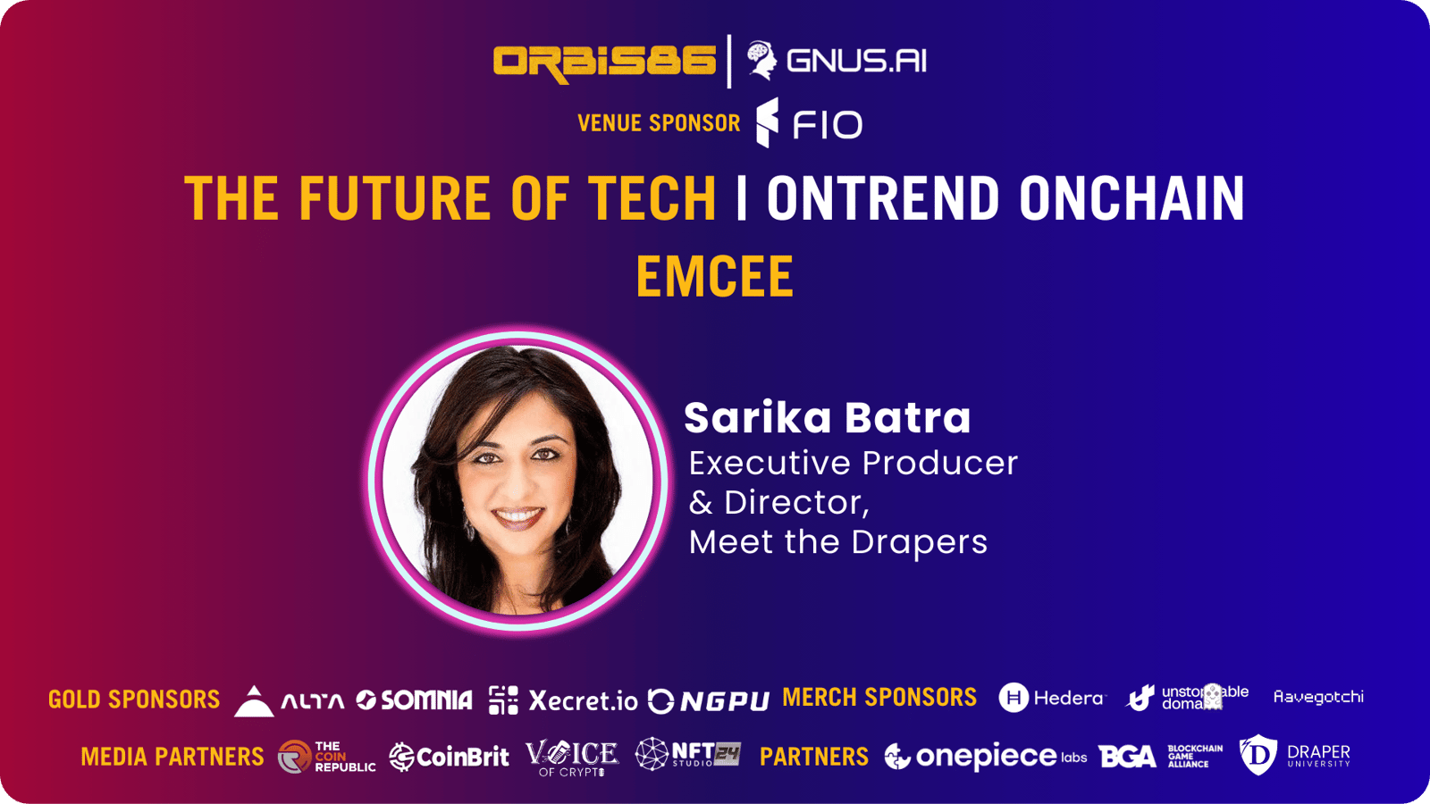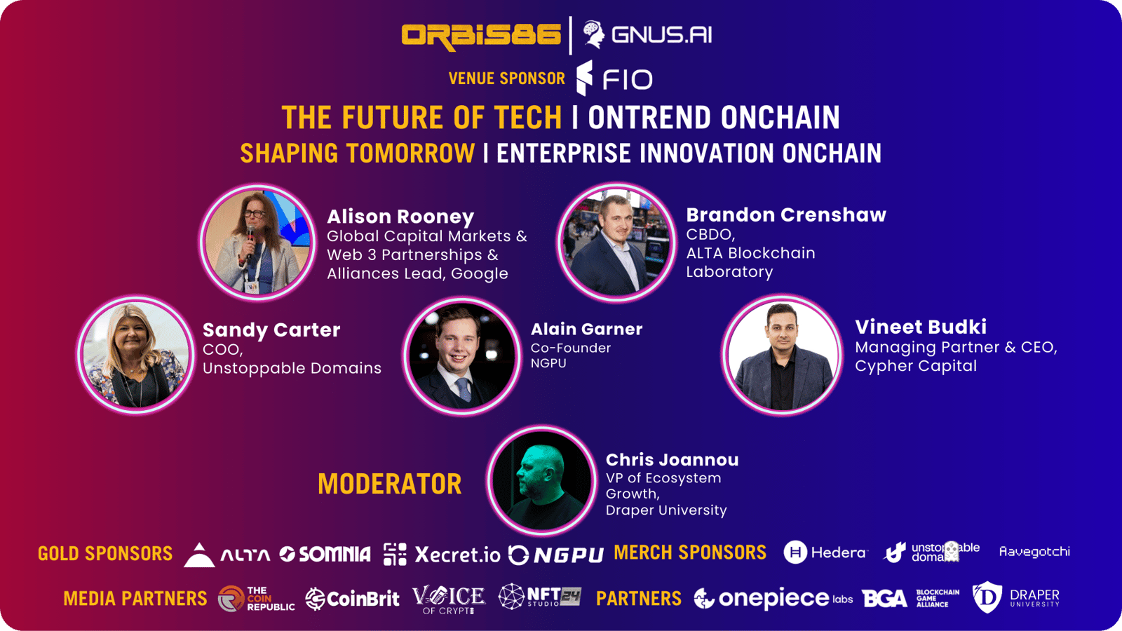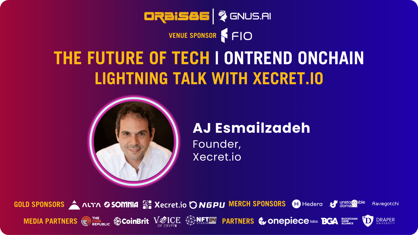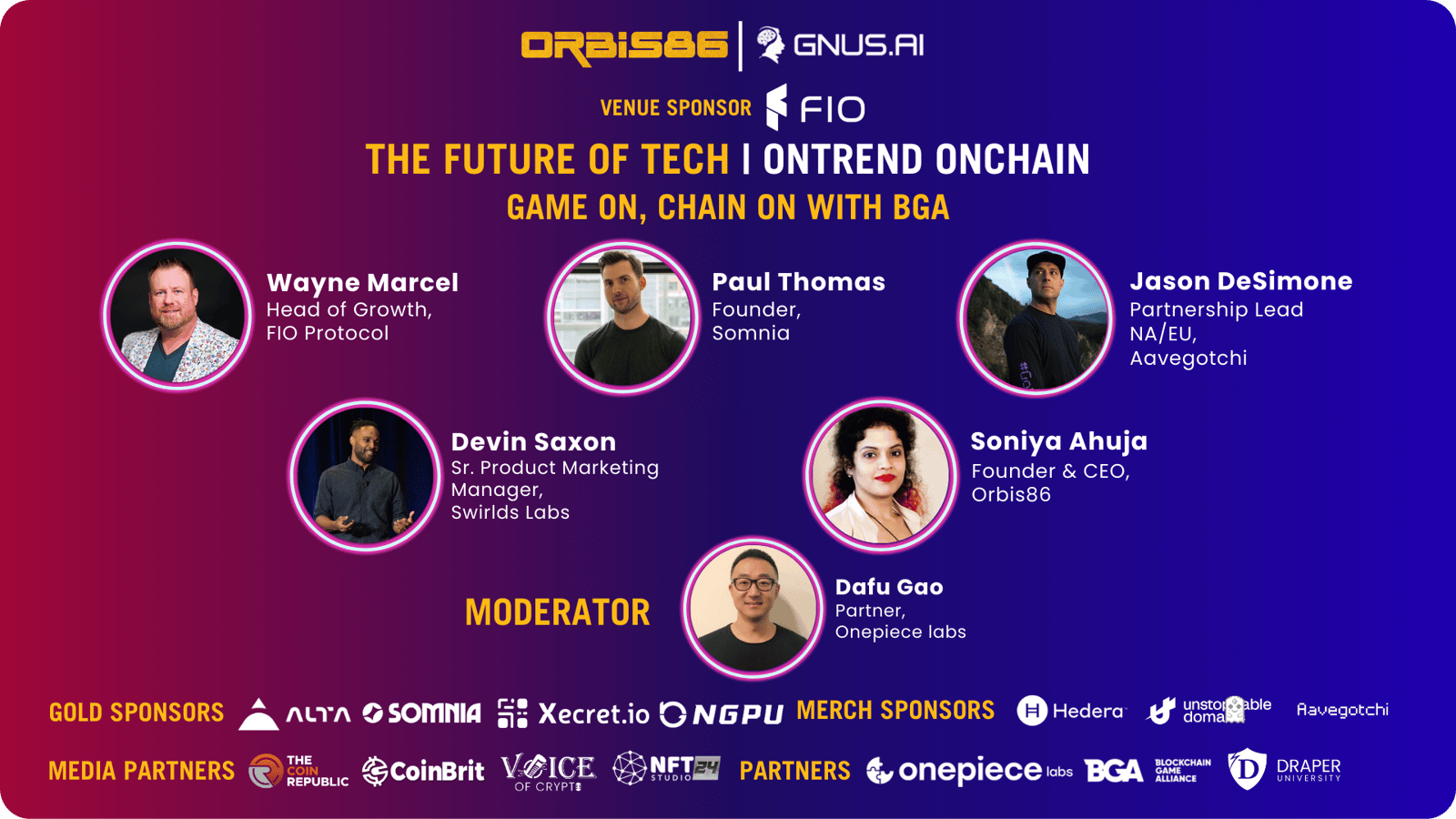 Embark on a tech-forward journey with Orbis86 at "Future of Tech: OnTrend OnChain," as a captivating event during Consensus by CoinDesk in Austin, Texas. Sponsored by GNUS.AI, FIO.net, ALTA, Xecret.io, Somnia, Hedera.com, Unstoppable Domains, NGPU & Aavegotchi; Join us as we delve into the latest trends and opportunities alongside investors, enterprises, and founders.