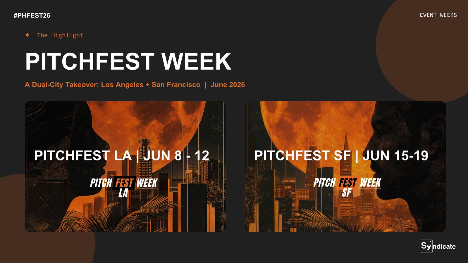 The highlight of our calendar is PitchFest Week in June: A dual-city takeover, featuring main stage pitches, VC dinners, panels, and networking events across LA and SF. Whether you're a founder looking to get in front of the right investors, an investor seeking curated deal flow, or a sponsor targeting the innovation economy — PitchFest is where founders meet capital.