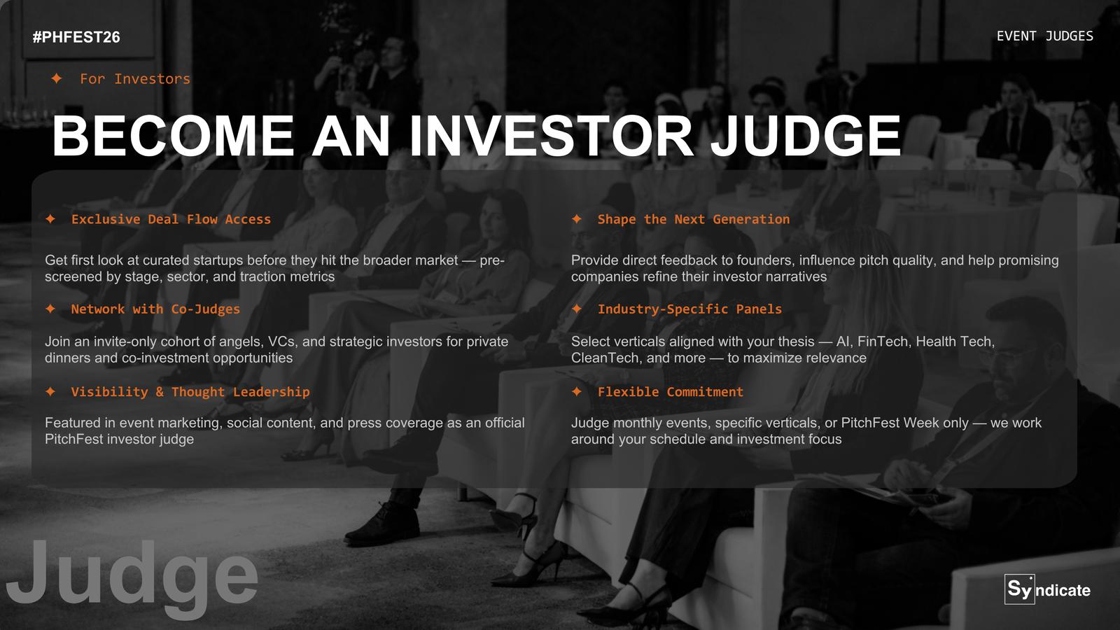 Whether you’re pitching or attending, this room is intentionally curated to maximize value for everyone involved.