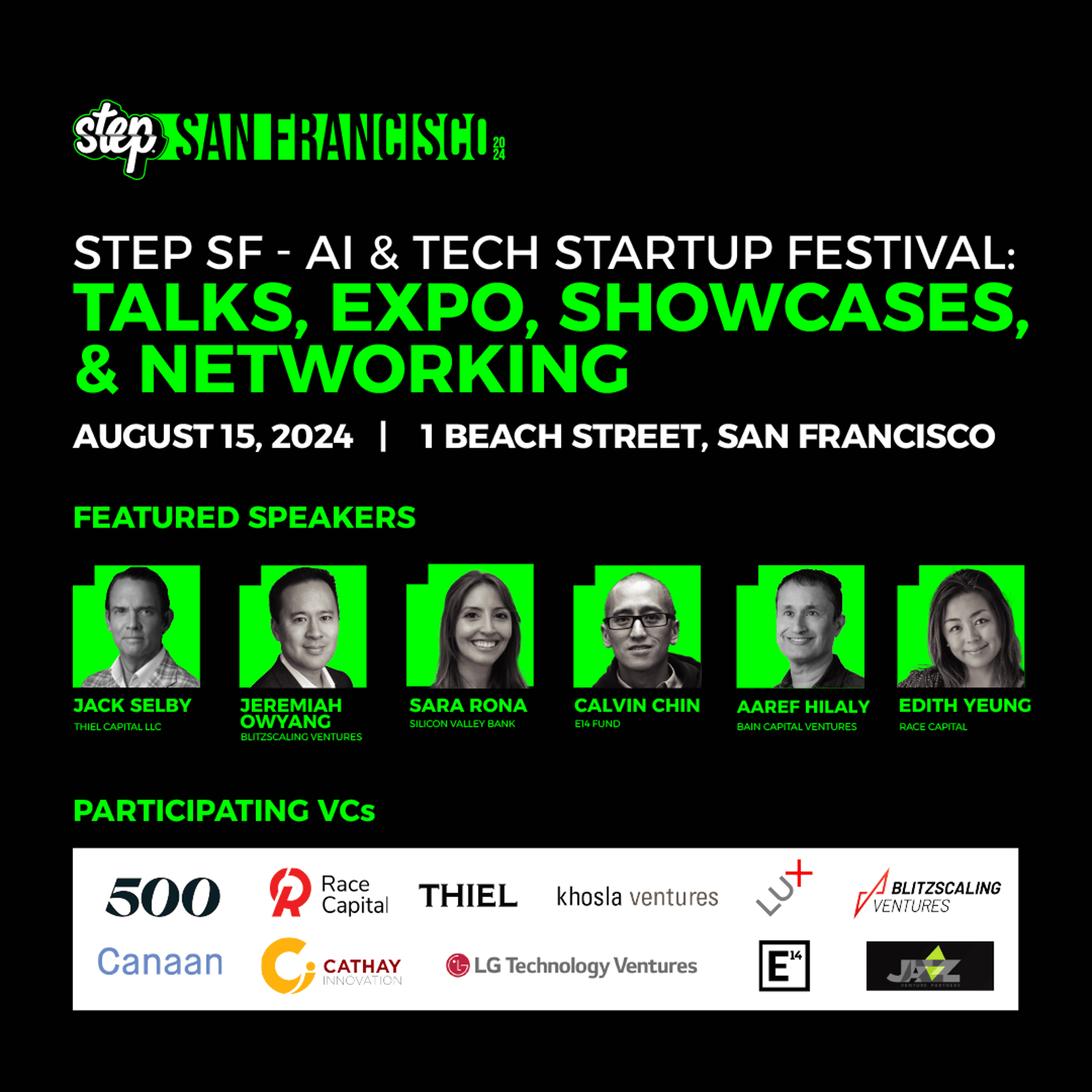 Step SF will feature top AI/Tech speakers from firms like Thiel Capital and Khosla Ventures, and host rising founders of the fastest-growing AI companies.