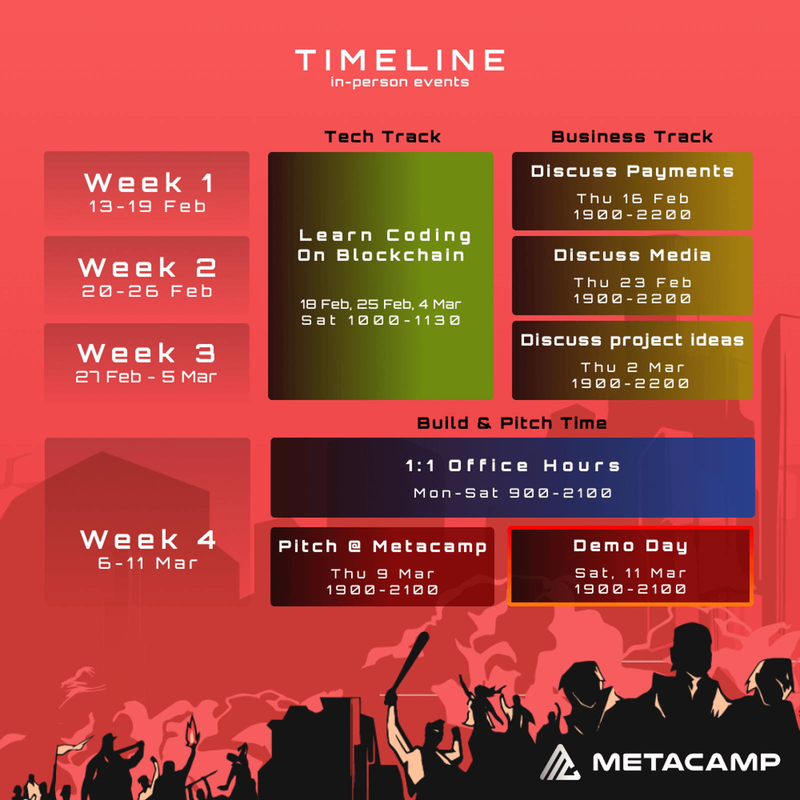 Metacamp's offline program includes various workshops with Tech and Business track, starting from Thu 16 Feb.