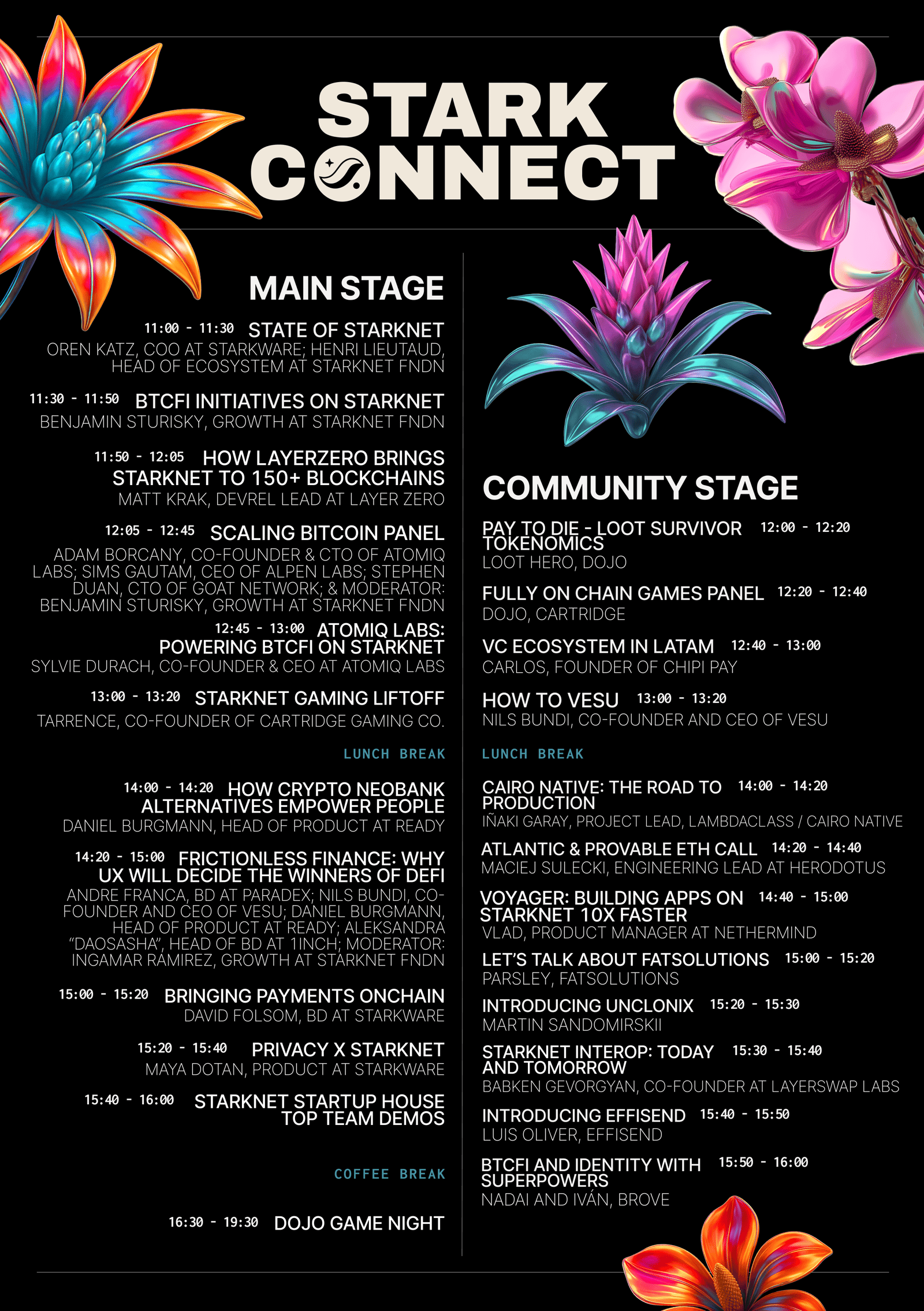 Catch keynotes, presentations, and panels on our stages featuring Starknet Foundation, StarkWare, and key ecosystem players.