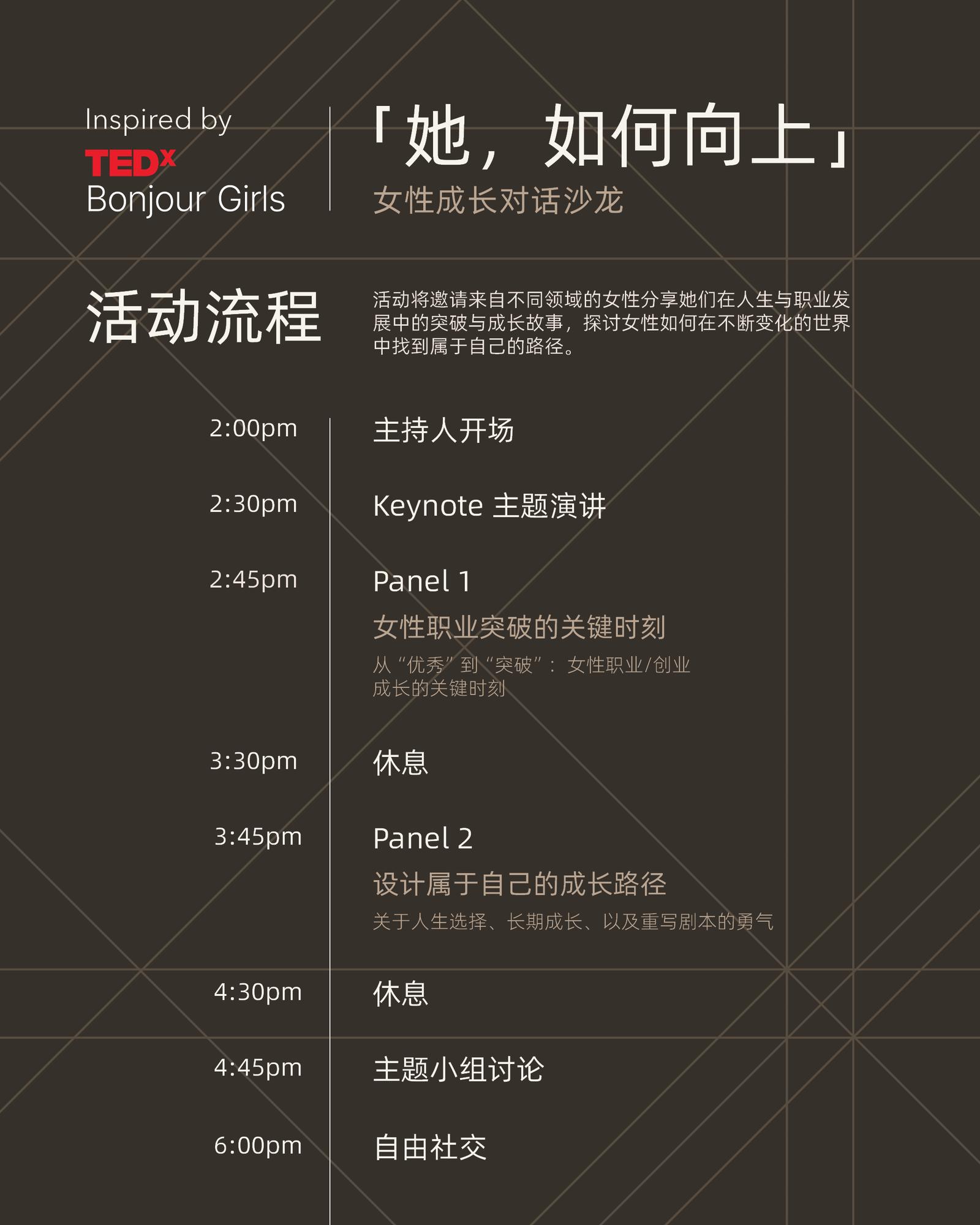 Inspired by TEDx Bonjour Girls Salon 是 TEDx Bonjour Girls 主论坛的延伸沙龙。