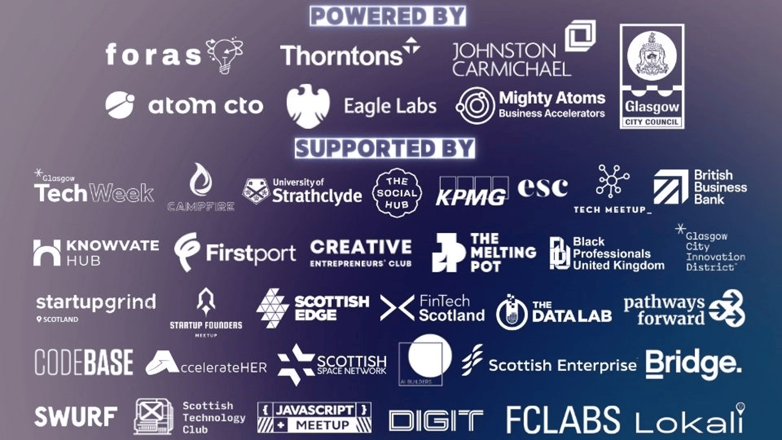 The event is powered by Foras, Glasgow City Council, Barclays Eagle Labs, Johnston Carmichael, AtomCTO, Thorntons Law, Mighty Atoms, and supported by Creative Entrepreneurs Club, GCID, Campfire, KPMG, Strathclyde University, Tech Meetup, The Social Hub, AI Builders Meetup, British Business Bank, Knowvate Hub, Firstport, Startup Grind Scotland, Black Professionals UK, Startup Founders Meetup, ESC, CodeBase, Scottish EDGE, Fintech Scotland, Pathways Forward, AccelerateHER, Scottish Space Network, DIGIT, Bridge Interactive, The Melting Pot, SWURF, The DataLab, Geovation Scotland, Scottish Technology Club, JS Meetup, Lokali and FC Labs
