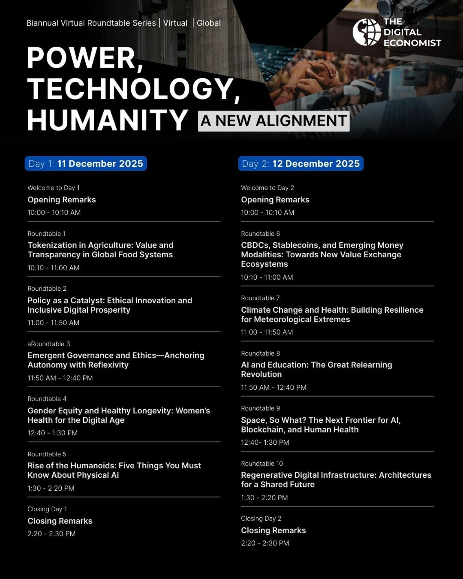 Across domains—from intelligent machines to new forms of value exchange, from climate-driven health pressures to space-based infrastructures—we will interrogate the shifts already underway and the frameworks required to guide them. This is an invitation to move from recognition to realignment: to ensure that technological progress advances human dignity, strengthens collective resilience, and expands shared prosperity.