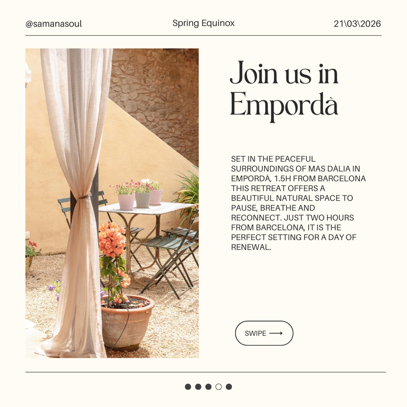 Set in the beautiful countryside of Mas Dàlia in Empordà, this one-day retreat invites you to slow down, reconnect with yourself and others, and celebrate the turning of the season together.