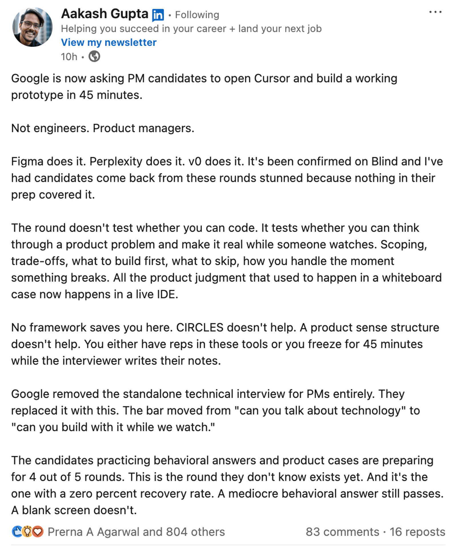 Companies like Google, Figma, and Perplexity increasingly expect PM candidates to build working prototypes live using AI coding tools.