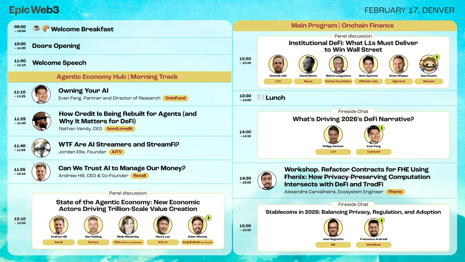 11:25 — 11:40 Keynote: “How Credit Is Being Rebuilt for Agents (and Why It Matters for DeFi)” (Nathan Vandy, CEO @bond.credit)