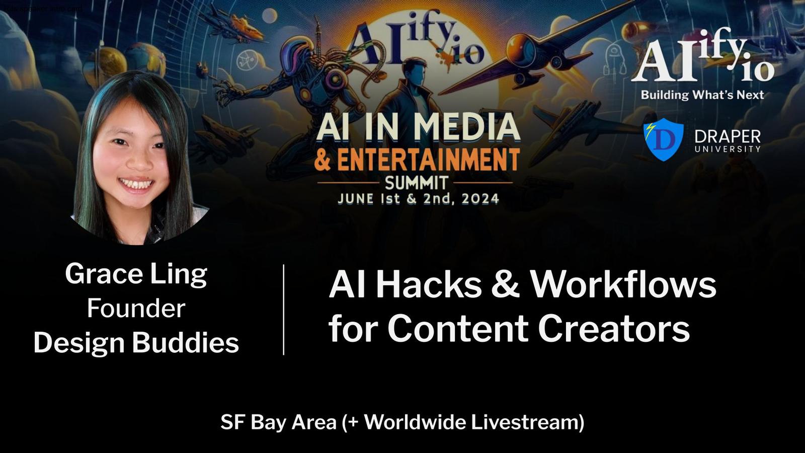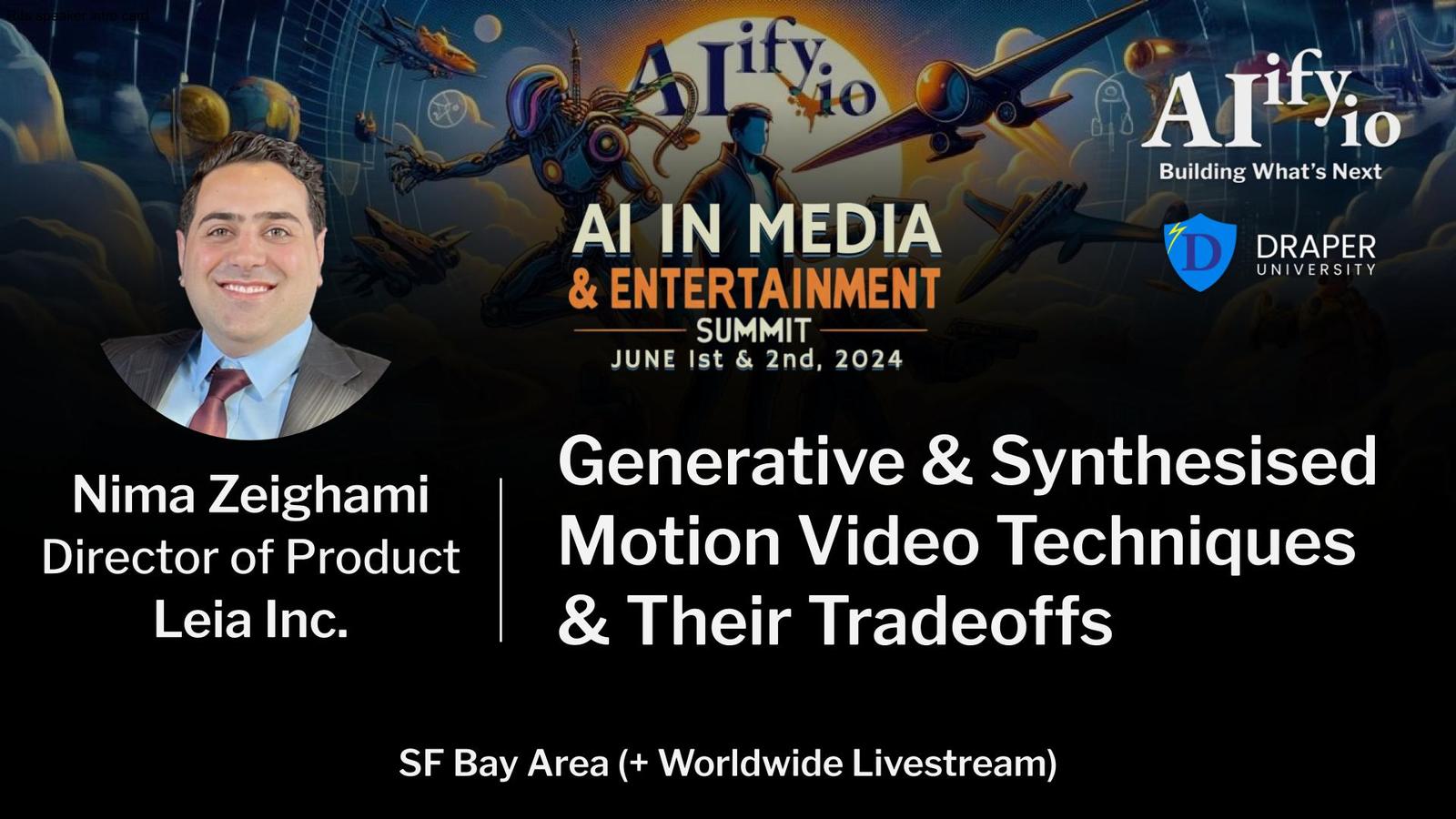 โMeet the industry leaders building todayโs cutting edge tools, and the creators pushing these tools to their limits. See how AI is changing the landscape of how media is produced, distributed, and consumed. From special effects and immersive worlds, to narration and music; from brilliant graphics and editing tools, to animation and storytelling; and from character generation and gaming, to marketing and social media, this event will open your eyes and mind, and provide valuable insights into whatโs possible. Confirmed speakers (including Emmy & Academy Award winner) hail from organizations such as Google, Amazon, Pika, Eleven Labs, Scale AI, Twelve Labs, Midjourney, PDI, Dreamworks, Leia, Oculus, Leap Motion, Civitai, CyberFilm, UC Berkeley, Stanford, and many more. For more info on speakers and programming, visit our webpage
