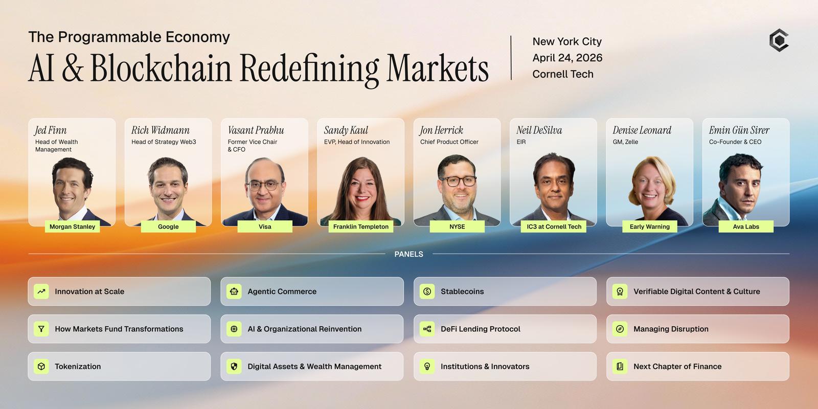 "The Programmable Economy: AI & Blockchain Redefining Markets" Conference takes place on April 24, 2026 at Cornell Tech in New York City, minutes from midtown.