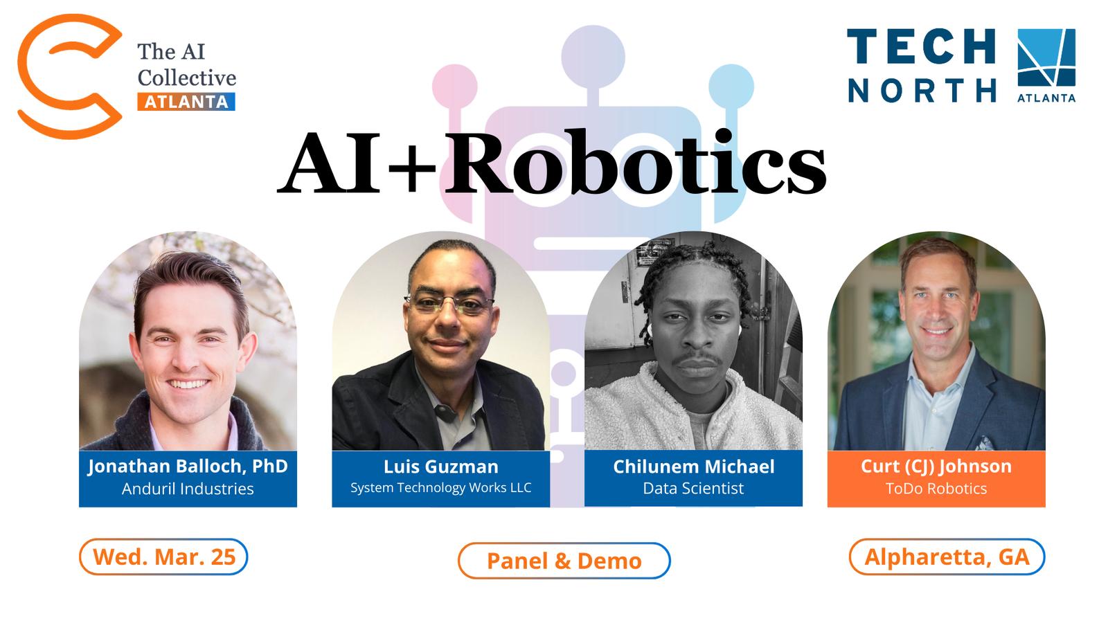 Artificial intelligence is rapidly moving beyond software into the physical world through robotics. Join The AI Collective Atlanta for a panel discussion & demo on Wed. March 25 at Tech North Atlanta. The panel will explore how AI is shaping the next generation of robots and intelligent machines. From autonomous systems and AI-powered perception to real-world applications in industry, security, logistics, and everyday life, this conversation will focus on what is working today and what is coming next.