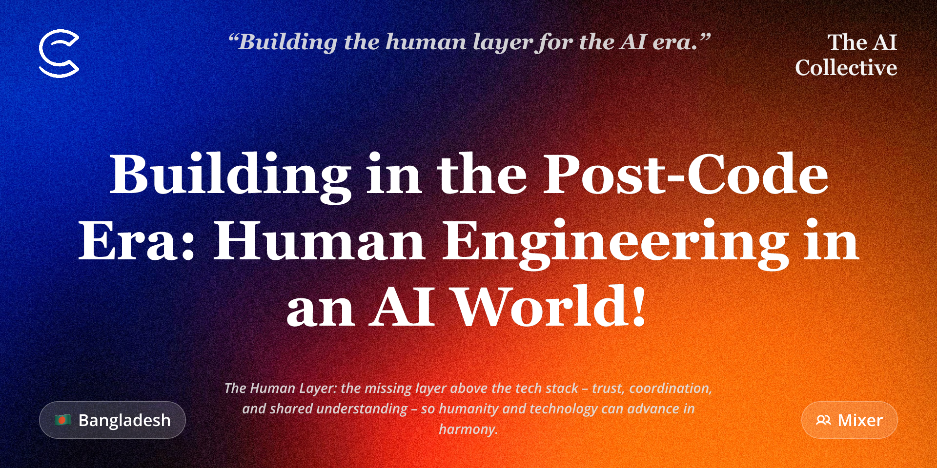 To find answers of these and many relevant questions, concerns, The AI Collective Bangladesh Chapter has arranged a casual conversation session, titled "Building in the Post-Code Era: Human Engineering in an AI World" where Tech-industry's leading brilliant Engineering experts will be sharing their thoughts, experience and enlighten on future of Software Engineering.