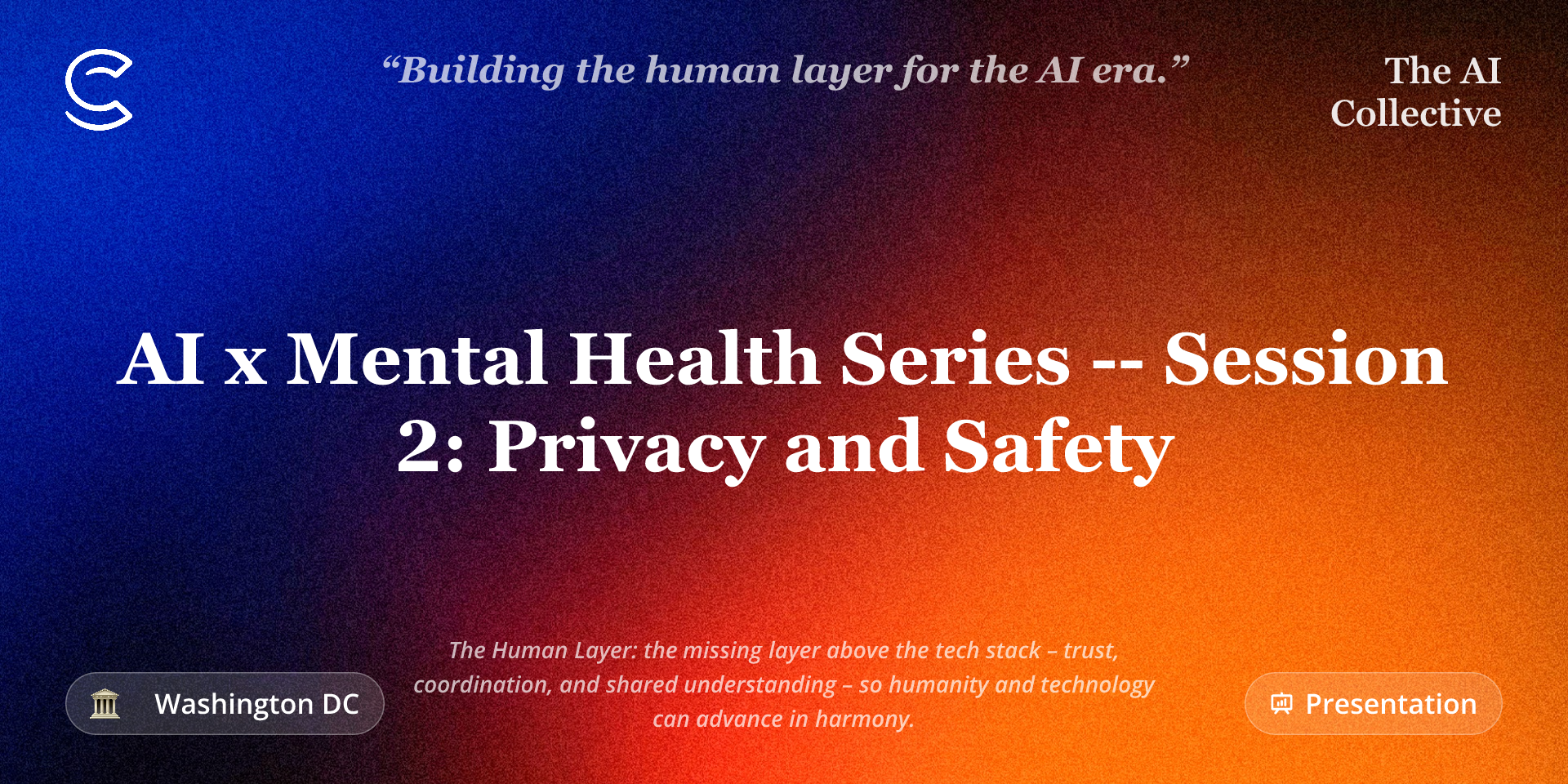 Join us for the second session of the AI x Mental Health Series, where we'll explore the intersection of AI, mental health data, and safety through breathwork, live visualizations, and a real-world look at how AI tools are assessed for clinical use. Whether you're a practitioner, builder, or just someone who's wondered what happens to your data after the session ends, this one's for you.