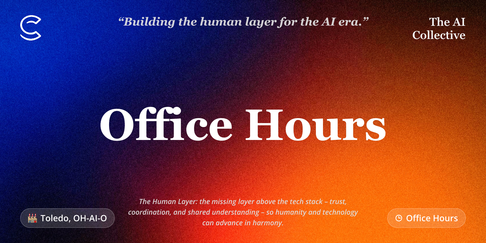 Join the AI Collective for AI Office Hours, an open Q&A session for anyone curious about artificial intelligence — from newcomers to active builders. Come early to Tech Nights at TolHouse (every 2nd and 4th Tuesday) to connect with local practitioners deploying AI in real businesses and projects. Bring your questions, ideas, or just curiosity. This is your chance to talk shop, share insights, and learn what’s happening in Toledo’s growing AI scene — no slides, no lectures, just honest conversation about what’s working (and what’s not) in the field.