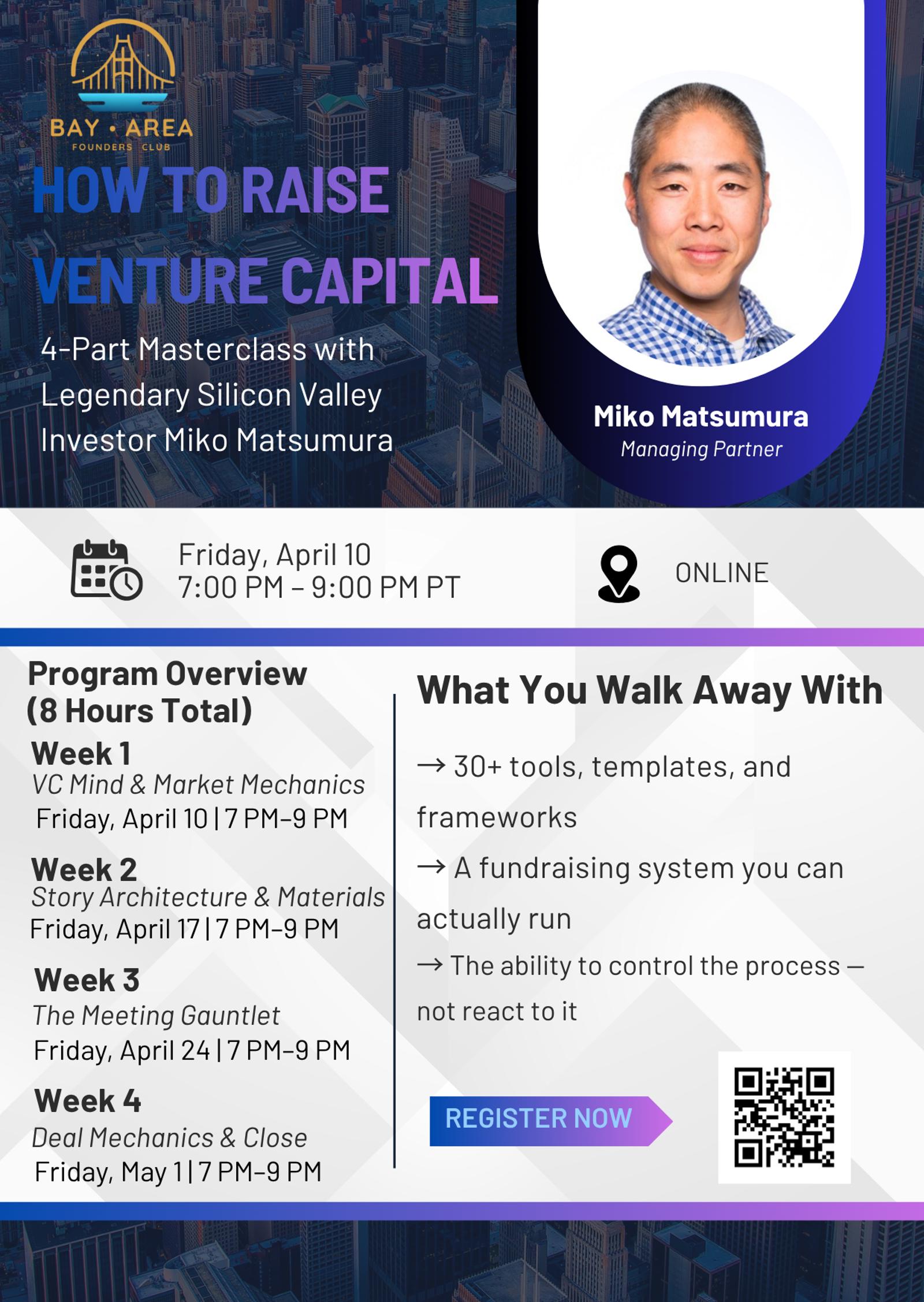 In this exclusive workshop, legendary Silicon Valley investor Miko Matsumurawill share how founders can successfully raise venture capital — based on 25+ years as a founder, operator, and VC.