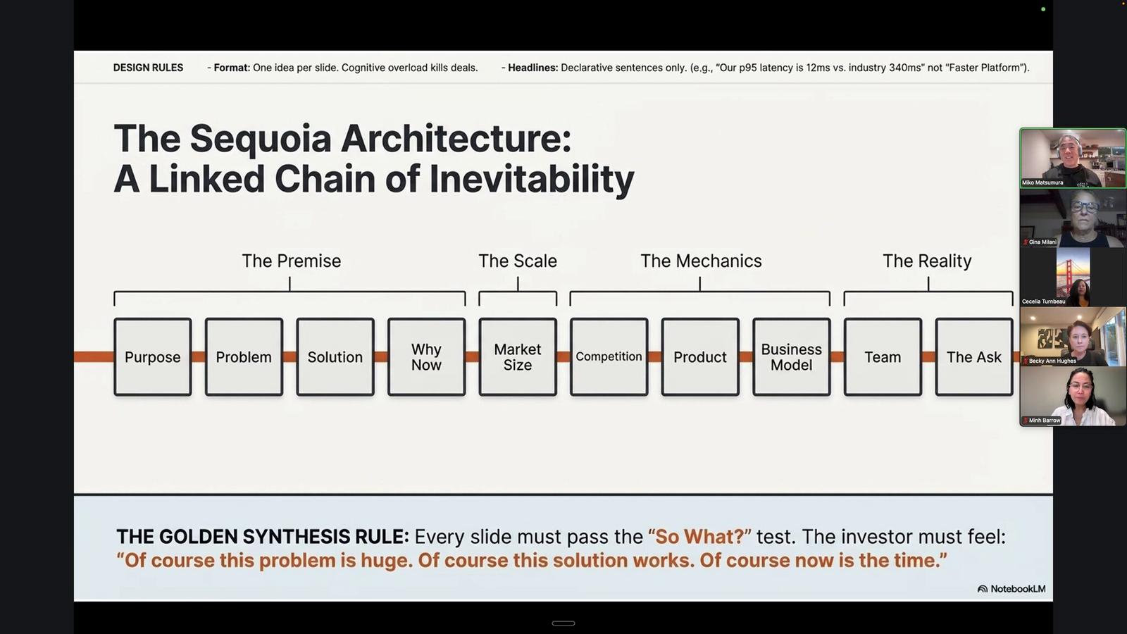Narrative structure, slide-by-slide breakdown, financial modeling that can survive due diligence — plus live hot-seat deck reviews.