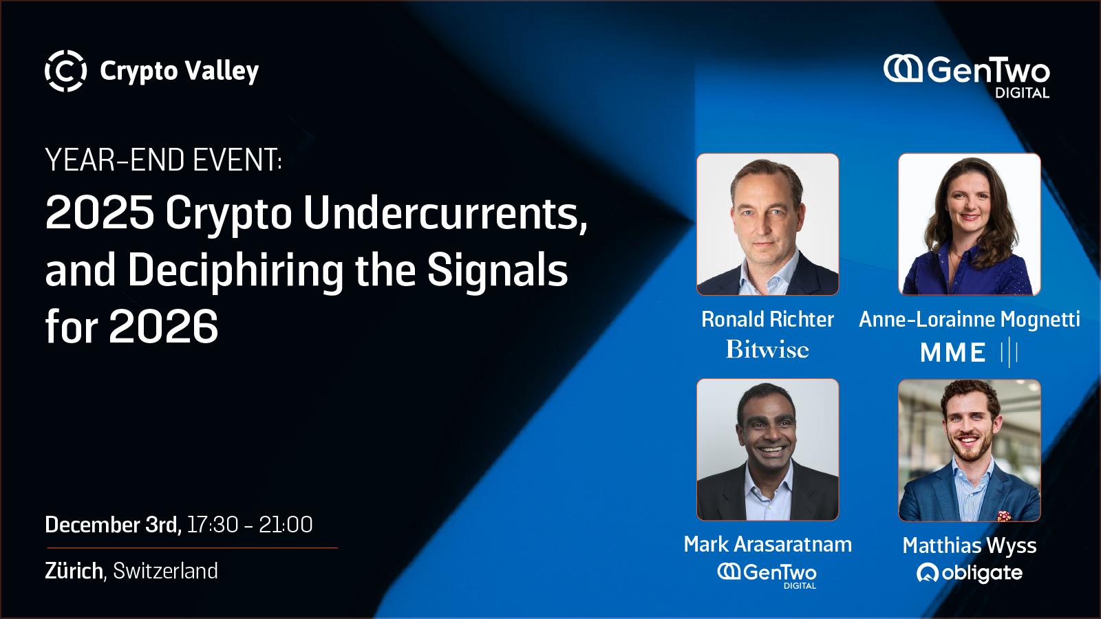 As 2025 draws to a close, the Crypto Valley Association convenes industry leaders from Bitwise, Obligate, MME and GenTwo for a dynamic discussion on the undercurrents shaping the crypto market today — and the signals pointing to what’s next in 2026.