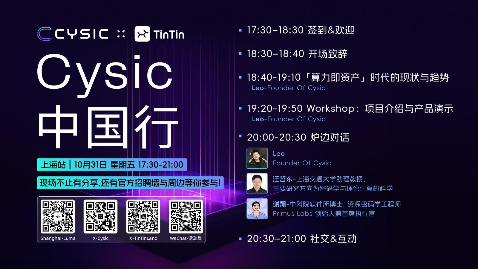 本次 Cysic 中国行将走进深圳 · 上海 · 杭州,核心团队将亲临现场,与开发者、机构、投资人和行业伙伴面对面交流,揭秘 ZK 技术加速落地的关键路径。
