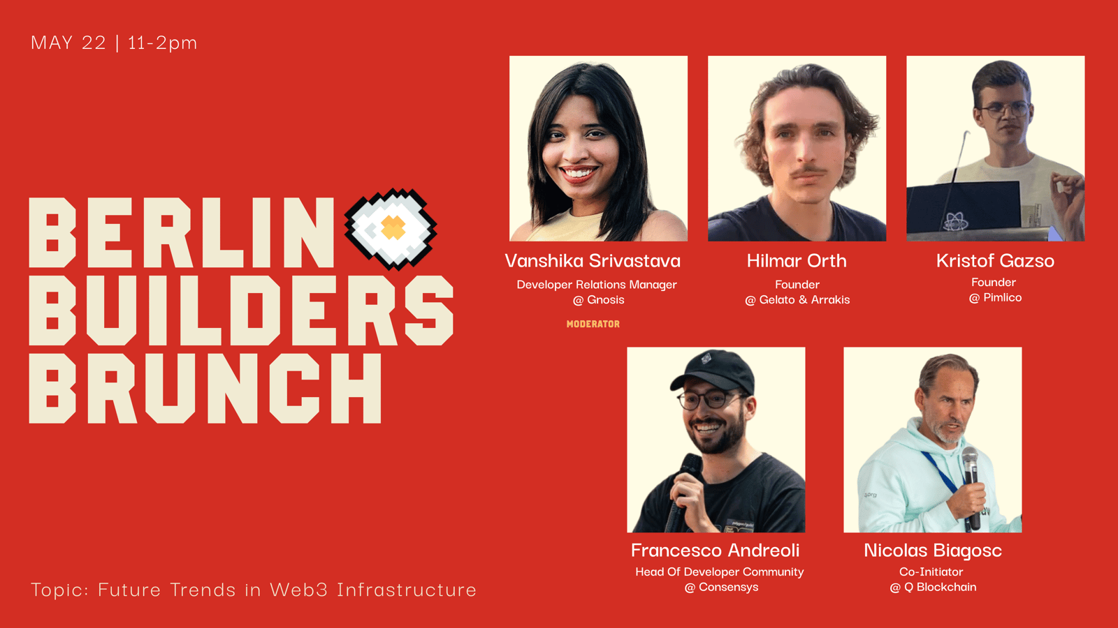 βWe're excited to announce our curated Builders Brunch Berlin, during big events DappCon, Safe{Con}, and ETHBerlin! Our global pop-up series has cultivated vibrant web3 communities, hosting some of the foremost thinkers + builders in web3.