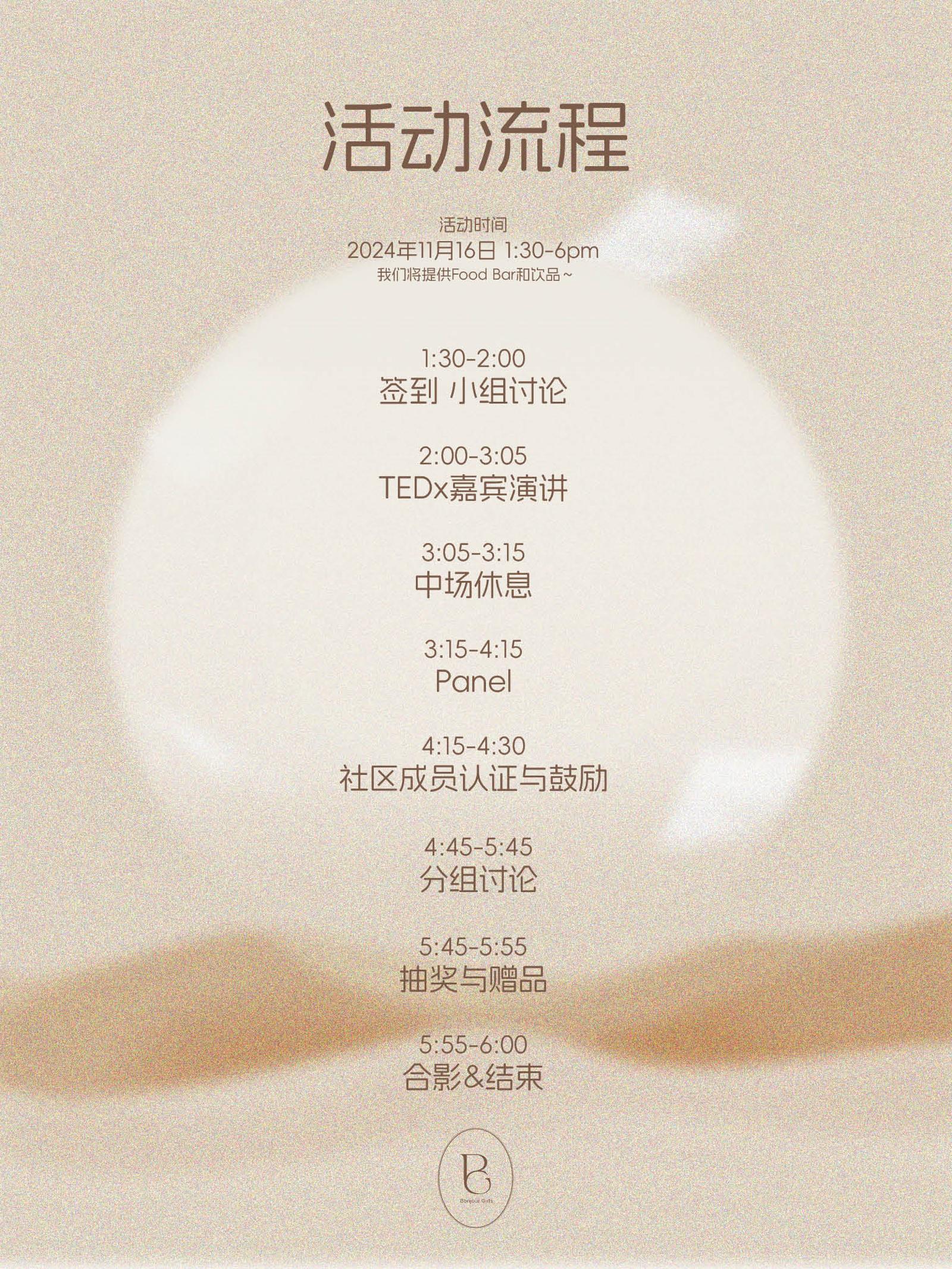今年的活动流程在TED演讲和panel分享的基础上,增加了小组讨论和互动的环节,各行各业的优秀嘉宾将分享她们的独特经历和见解。此外,我们还为社区成员准备了特别的认证与鼓励环节,感谢大家对bonjour girls的喜爱和支持,也庆祝每一位女性在各自领域中的卓越成就。