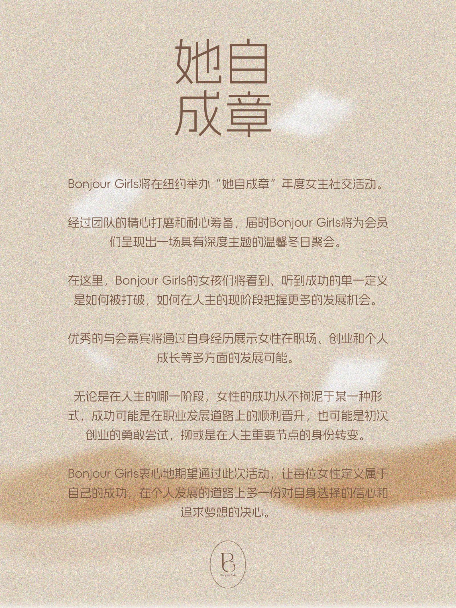 Bonjour Girls 2024年度之作 “她自成章”,旨在打破女性成功的单一定义,展示女性在职业、创业和个人成长等方面的多维发展路径。本次活动,我们邀请了十余位华人女性嘉宾,与大家一同探讨如何追寻、接纳并成为真正的自己,找到热爱的领域并坚定前行。她们来自不同行业,拥有各异的背景,却都遇到过与你我相似的困境。她们将分享一路上的探索与坚守,以及面对挑战时的智慧与勇气。相同的是,无论身处何境,她们都选择了温柔接纳自我,书写自己的精彩篇章。