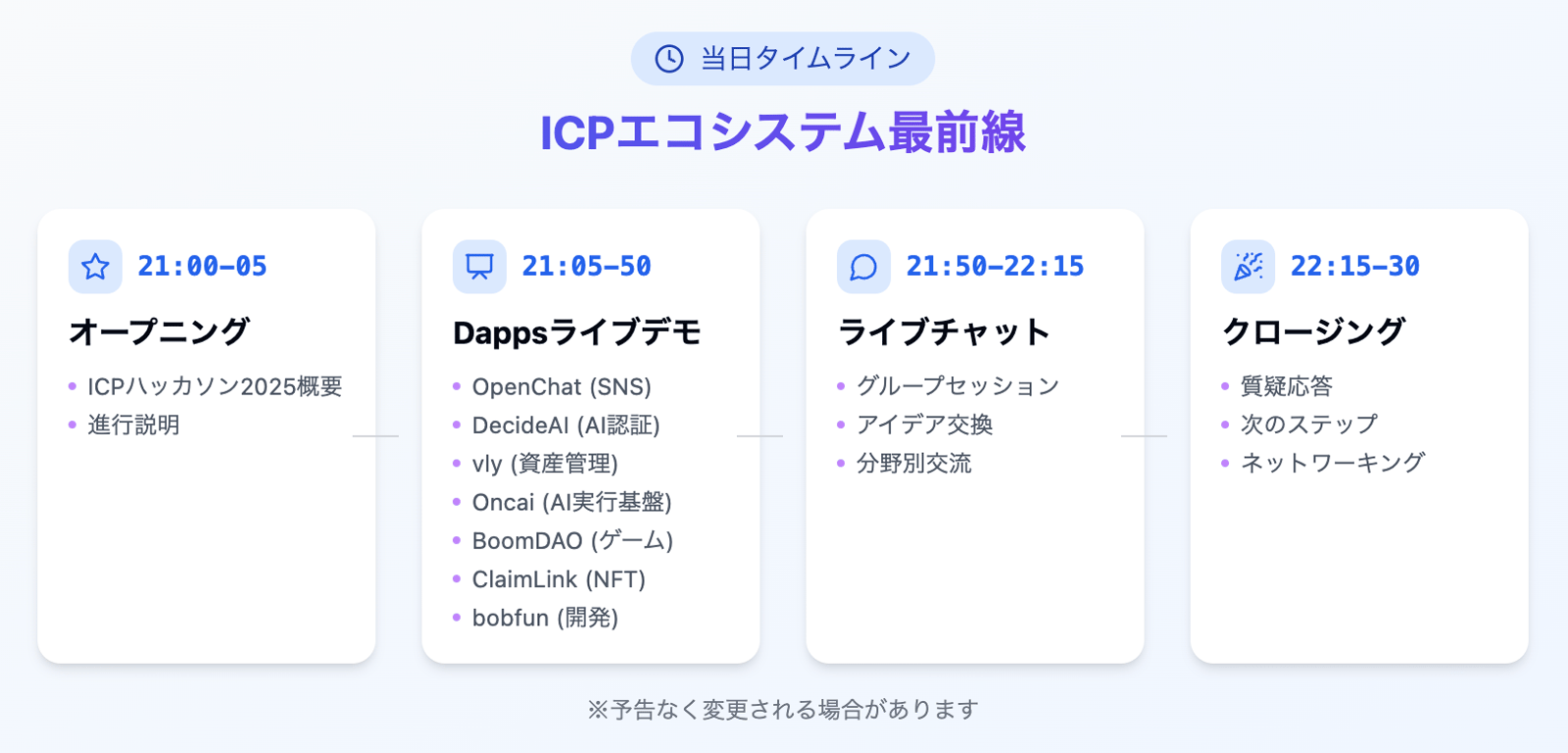 ICPハッカソン2025 に関連して、ハッカソン参加者にアイデアのインスピレーションを提供することを目的としています。Internet Computer Protocol (ICP)の魅力的な世界を体験できる特別イベントを開催します!