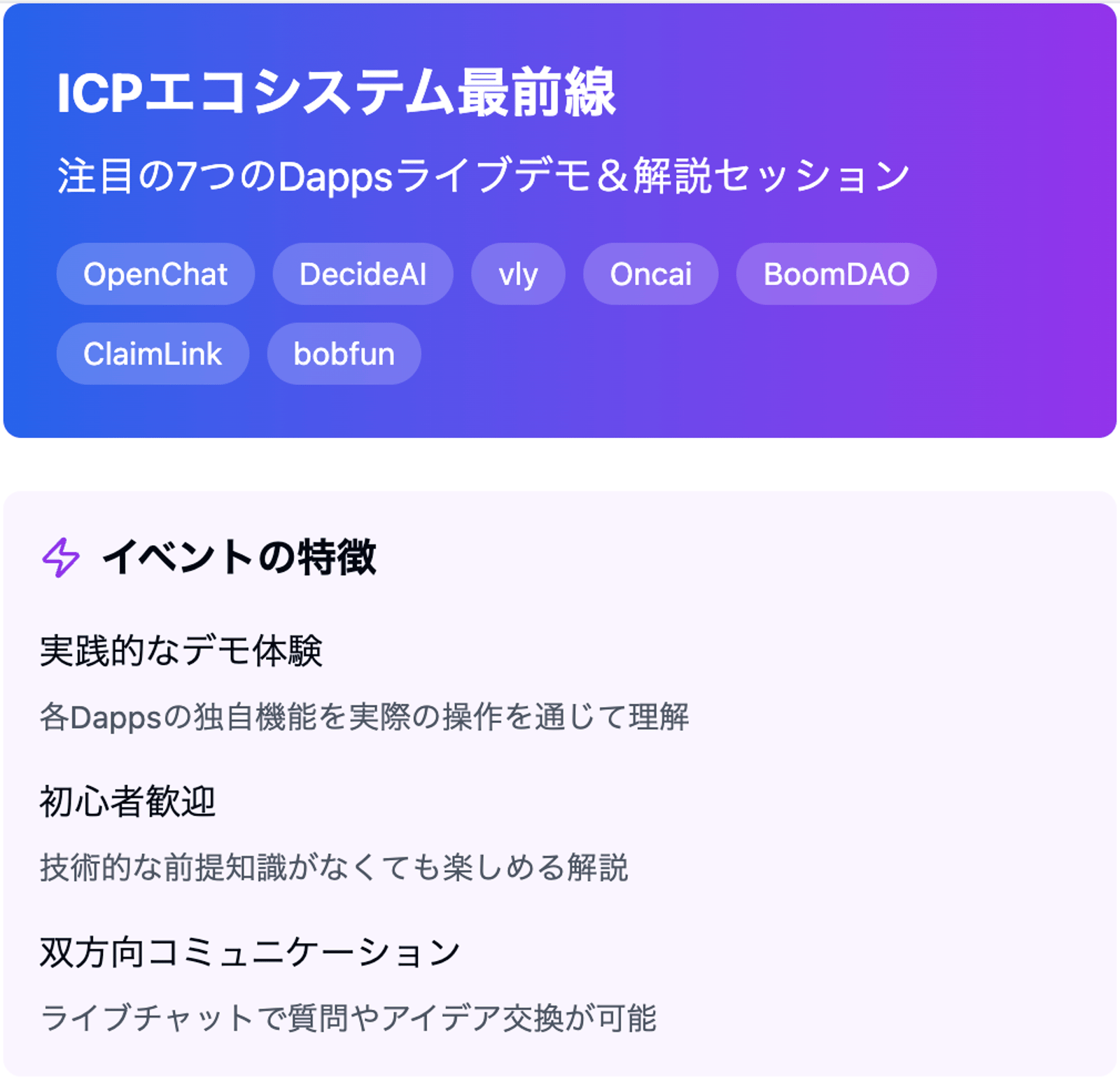 ICPハッカソン2025 に関連して、ハッカソン参加者にアイデアのインスピレーションを提供することを目的としています。Internet Computer Protocol (ICP)の魅力的な世界を体験できる特別イベントを開催します!