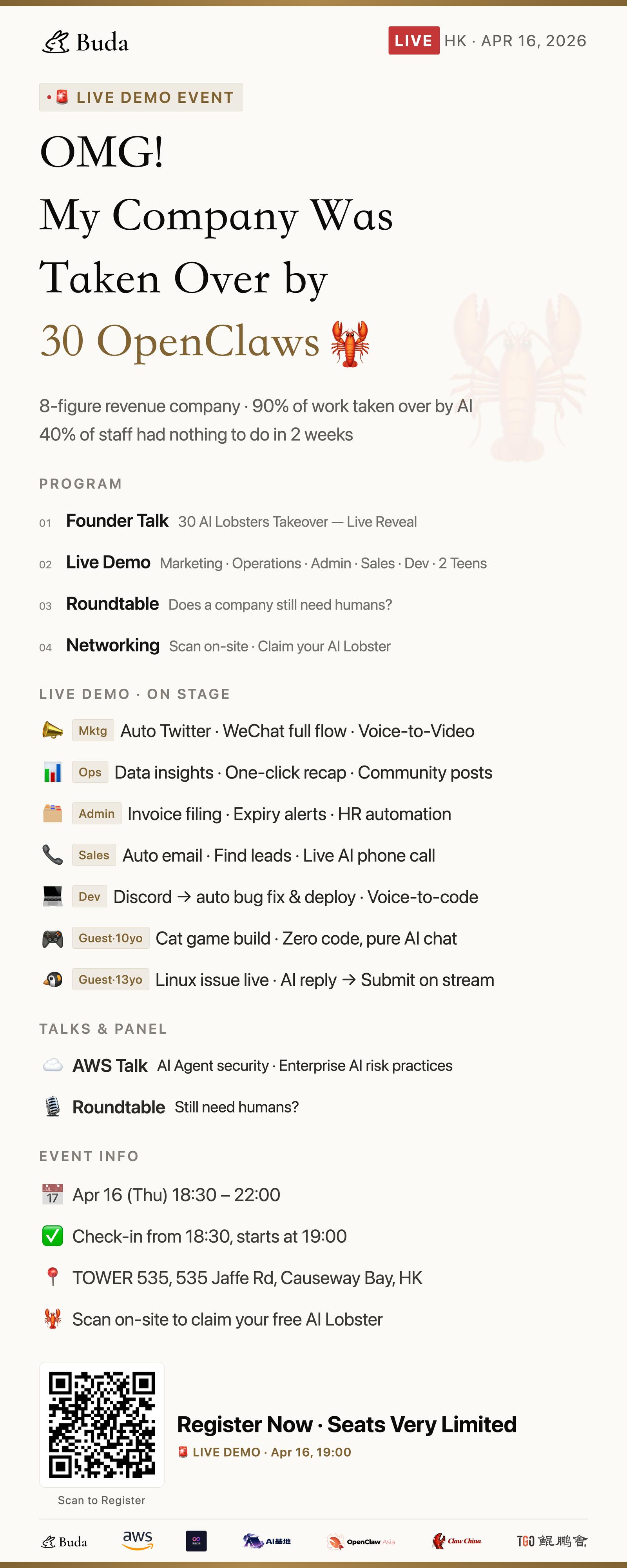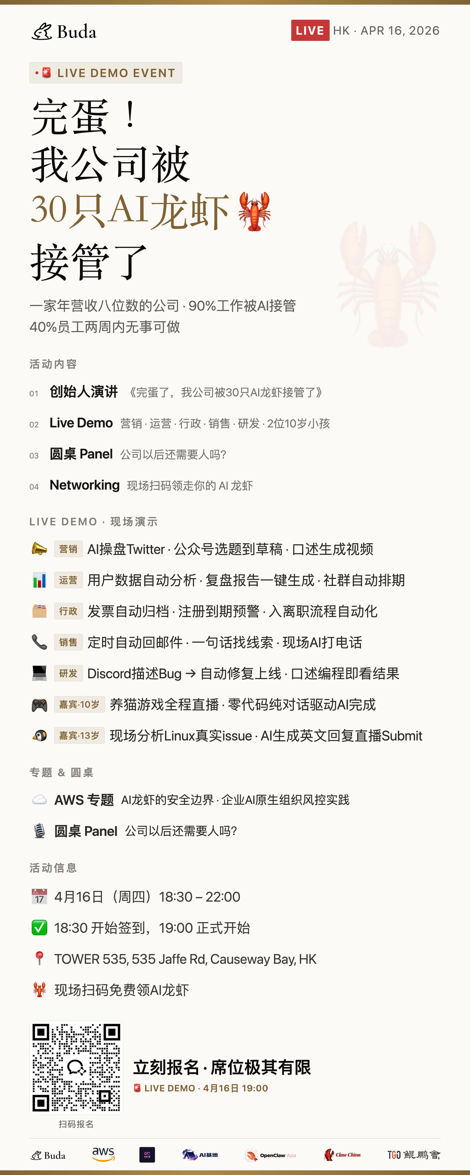未来公司还需要人吗?Buda 兔兔养虾专家、AWS 亚马逊云专家、OpenClaw Asia 创始人、硬核 Builder 与转型成功的企业操盘手同台交锋。随后进入无差别交流模式,在这里,你遇到的人可能就是你下一个合伙人或种子客户。