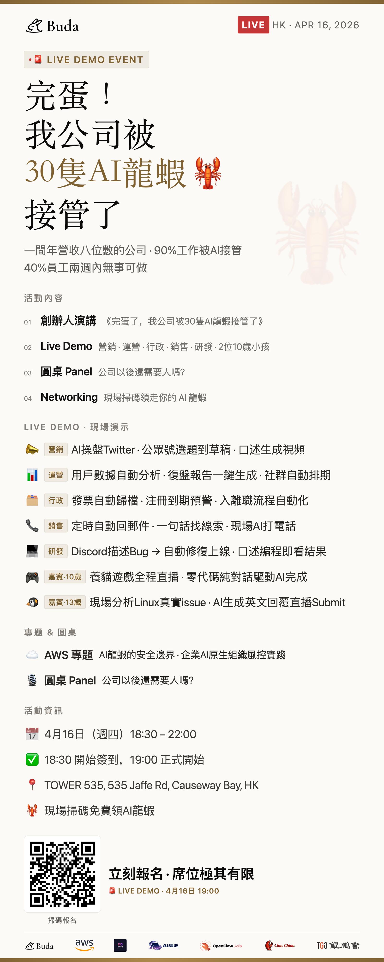 未來公司仲需要人嗎?Buda 兔兔養蝦專家、AWS 亞馬遜雲專家、OpenClaw Asia 創辦人、Hardcore Builder 同轉型成功的企業操盤手同台交鋒。