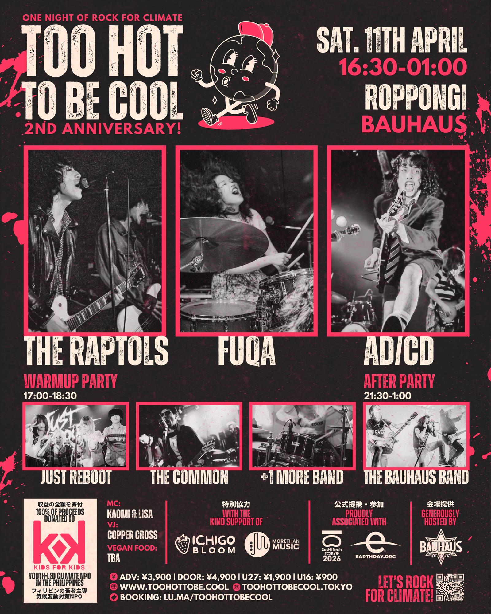 2024年4月より、Too Hot to Be Coolは東京のロックシーンを一つにまとめ、東南アジアの若者主導の環境NPOのための資金調達を行っています。最初の6エディションで、タイ、フィリピン、ベトナム、マレーシア、インドネシアの気候団体に100万円以上を集めました。