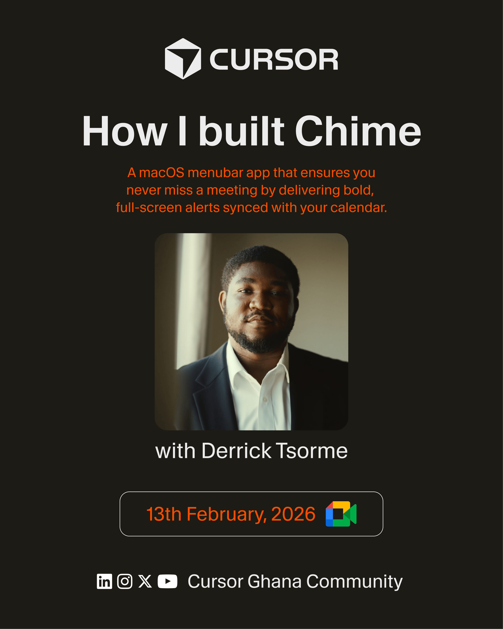 Cursor Ghana Community is excited to host a “How I Built This” session with Derrick Tsorme, the creator of Chime, a macOS menubar app that helps users never miss another meeting by showing impossible-to-ignore full-screen alerts synced with your calendars.