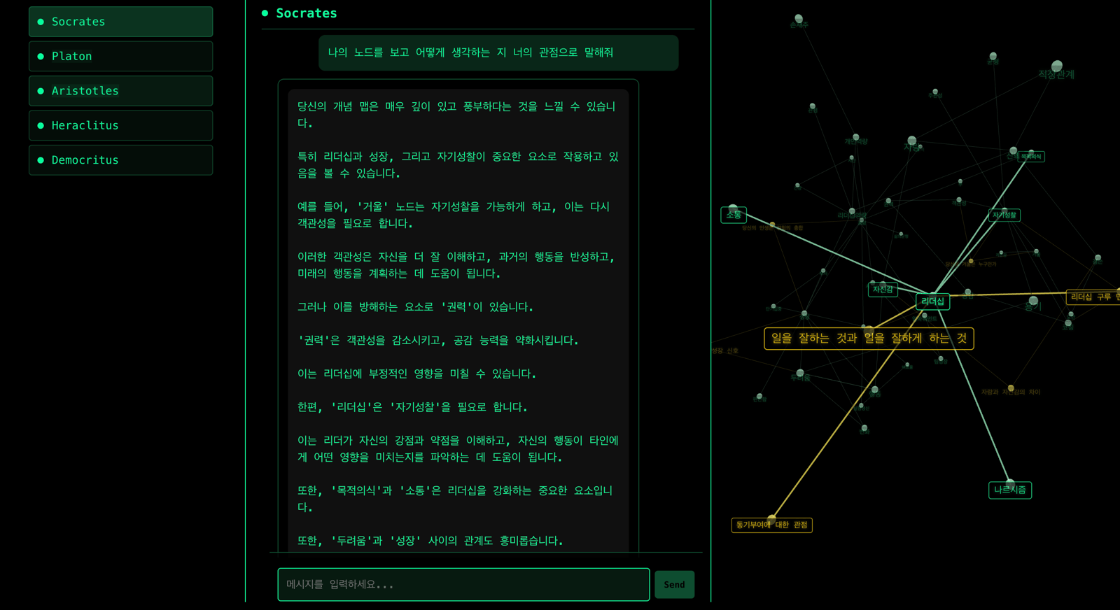AI가 여러분의 기록을 기반으로 AI와 문답할 수 있게 되며 단순한 회고를 넘어 새로운 디지털 자아를 창조하는 여정이 됩니다. 문답의 과정에서 어떤 노드 그리고 어떤 참고 문헌에서 그런 답변이 나왔는지 확인할 수 있기 때문에 설명 가능한 답변을 제공합니다.