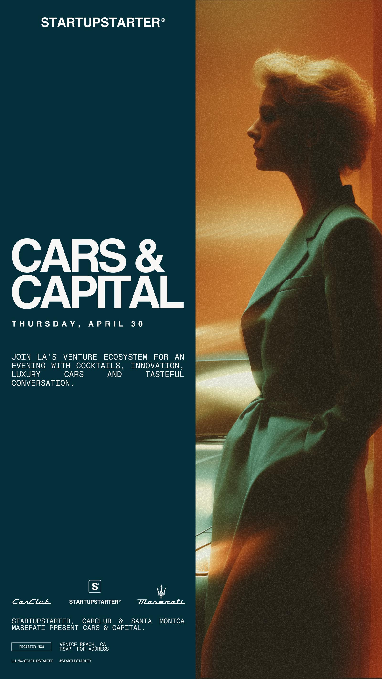 Join us for a special edition of Cars & Capital as we come together at an iconic venue in Venice's Windward Plaza at 57 Windward. This curated experience brings seasoned and new investors, family offices, creators, HNWI, and top founders together for an exclusive night of top-level connections.