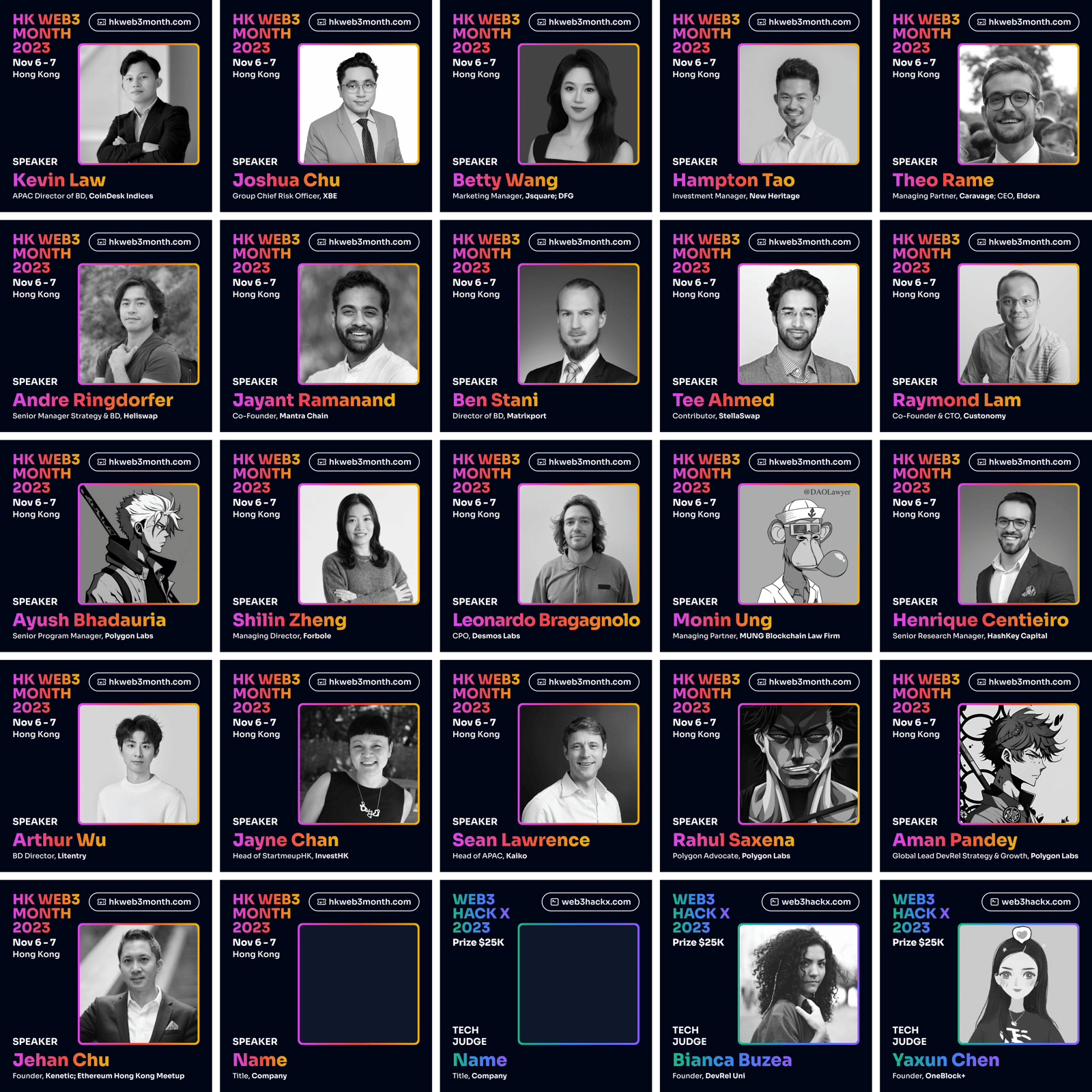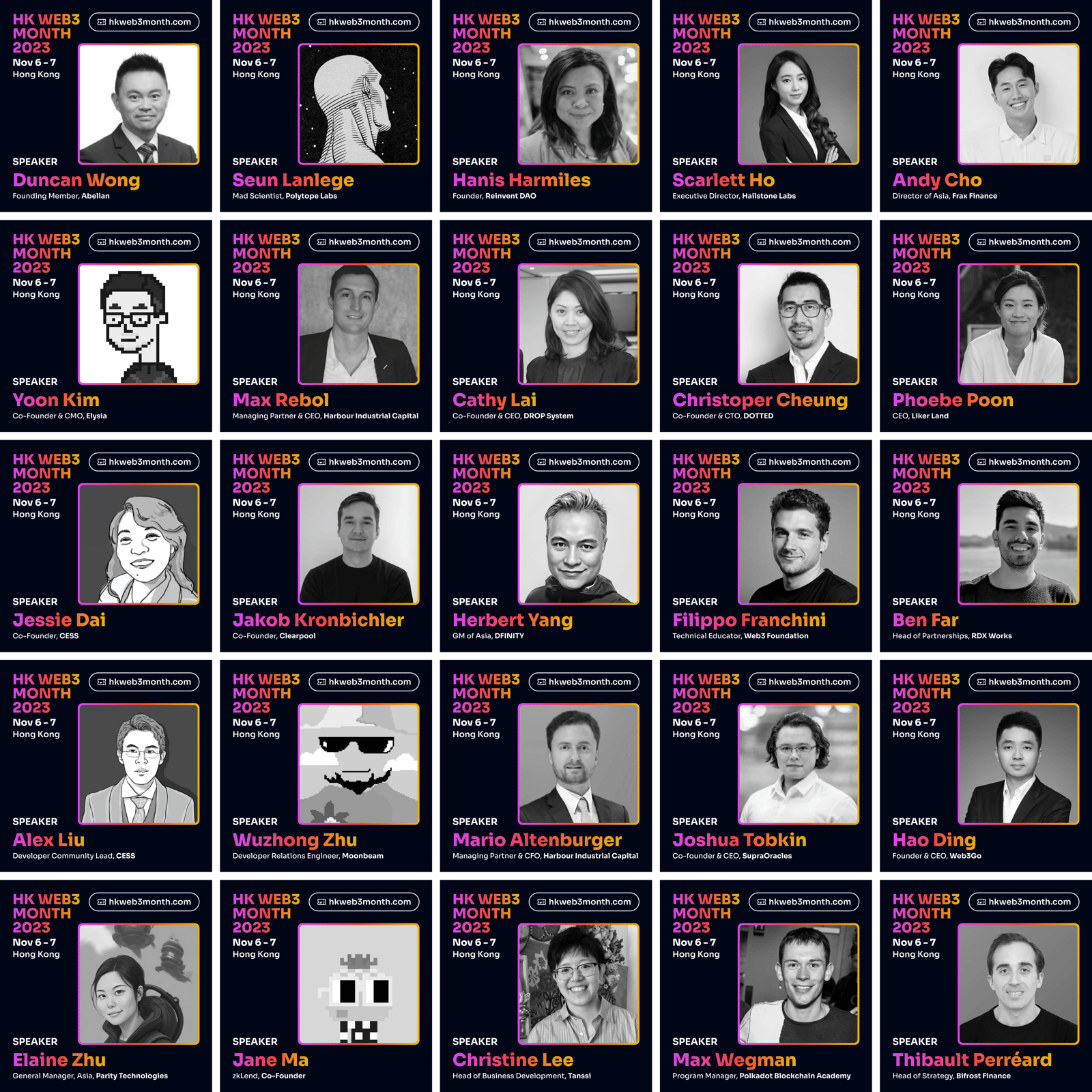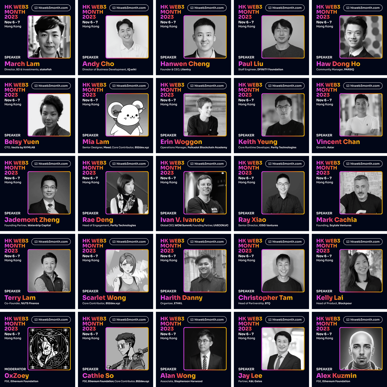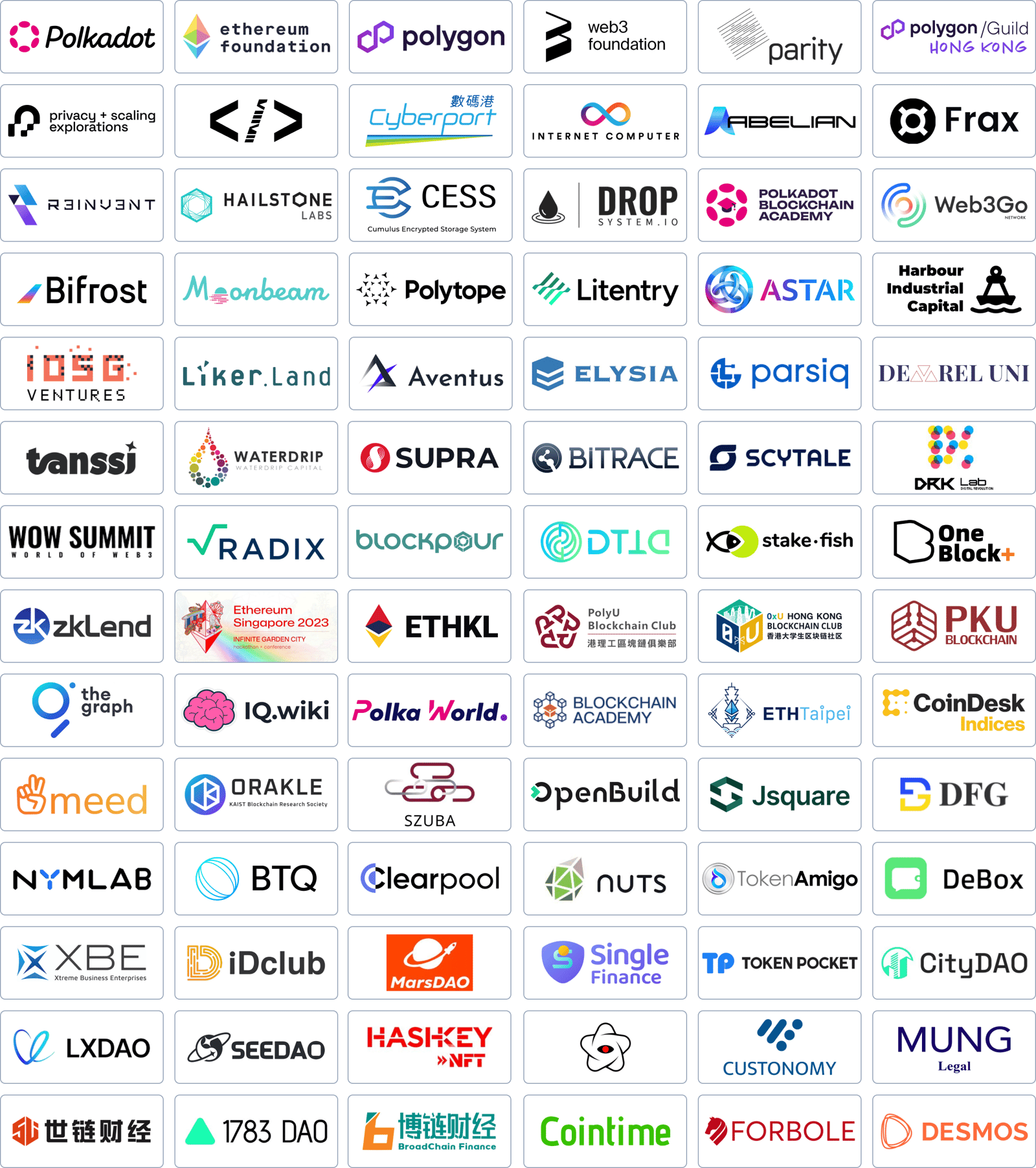 HK Web3 Month Conference a community collective effort by unnamed contributors in supporting the Hong Kong Web3 startup ecosystem. The Conference and virtual hackathon Web3 Hack X, can’t be made possible without supporting organizations, media and community partners, guests, including, Polkadot, Parity Technologies, Web3 Foundation, Ethereum Foundation’s Road to Devcon grants, Polygon Labs, Polygon Guild HK, 852dev, Astar, WOW Summit, DFINITY Foundation, IOSG Ventures, Scytale Ventures, Waterdrip Capital, Jsquare, DFG, Harbour Industrial Capital, Polkadot Blockchain Academy, Polytope Labs, Litentry, Moonbeam, Tanssi, Web3Go, Bifrost Finance, Abelian, Frax Finance, IQwiki, Radix, Clearpool, Hailstone Labs, BTQ, SupraOracles, Meed, DROP System, NYMLAB, stakefish, DTTD, zkLend, Reinvent DAO, Elysia, K&L Gates, MUNG Legal, Stephenson Harwood, NUTS Finance, Blockpour, ETHKL, CoinDesk Indices, Token Amigo, Aventus, DevRel Uni, DRK Lab, Bitrace, Ethereum Singapore, PolyU Blockchain Club, 0xU, Blockchain Academy, The Graph, Polka World, Orakle, SZUBA, Openbuild, and many more.