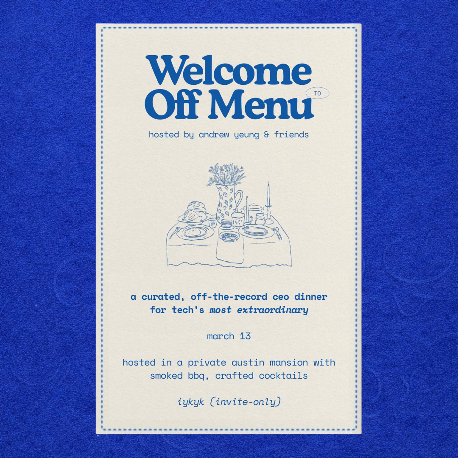 I'm hosting "off menu" – a curated off-the-record ceo dinner at a private mansion, 5 mins away from downtown austin