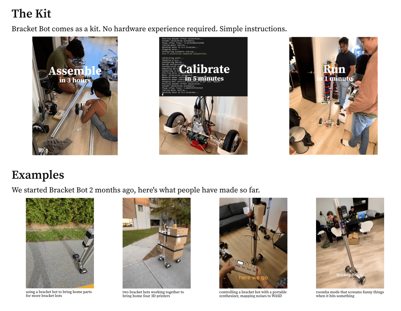It's an open source robotics dev kit, with simple instructions and no hardware experience required. With only a couple hours of assembly and only 10 minutes to get the software going, with Bracket Bot you can: