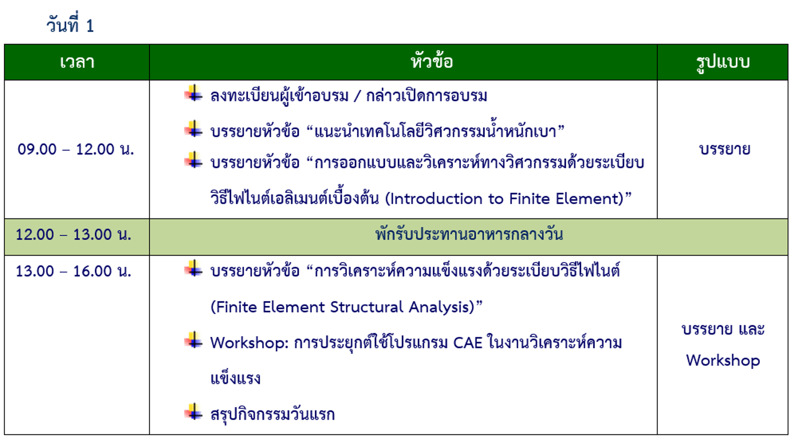 พักรับประทานอาหารว่างระหว่างเวลา 10.30-10.45 น. และ 14.30-14.45 น. และพักรับประทานอาหารกลางวันระหว่างเวลา 12.00-13.00 น.