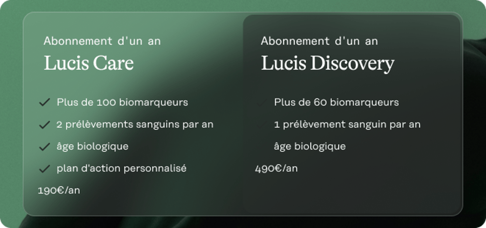 • Lucis Care: 110 biomarqueurs, sang + salive + urine