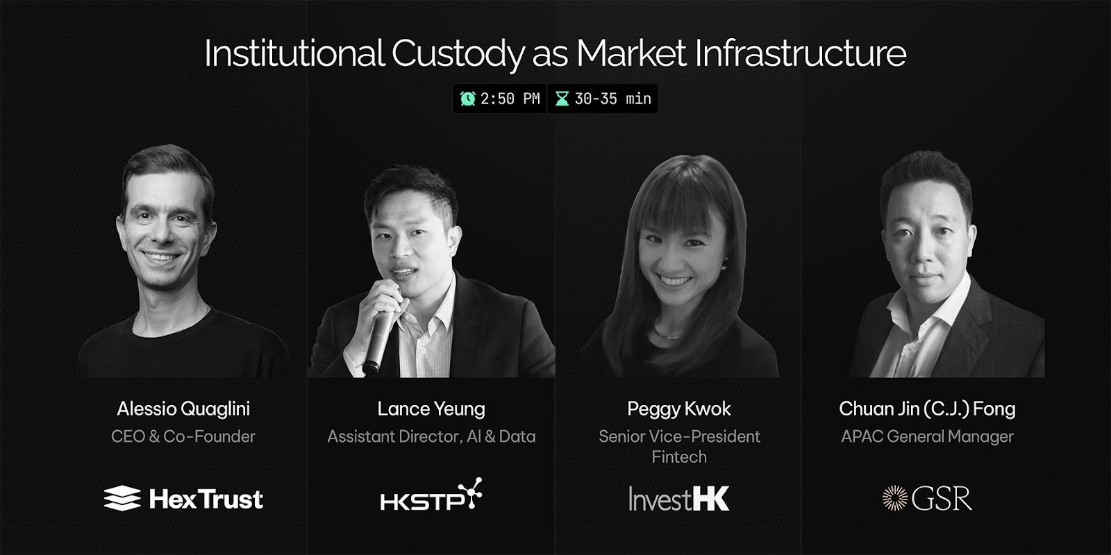 The flagship discussion of the afternoon centers on Institutional Custody as Market Infrastructure, examining how custody, compliance, settlement, and operational controls function as the foundation for institutional participation in digital asset and tokenized markets.