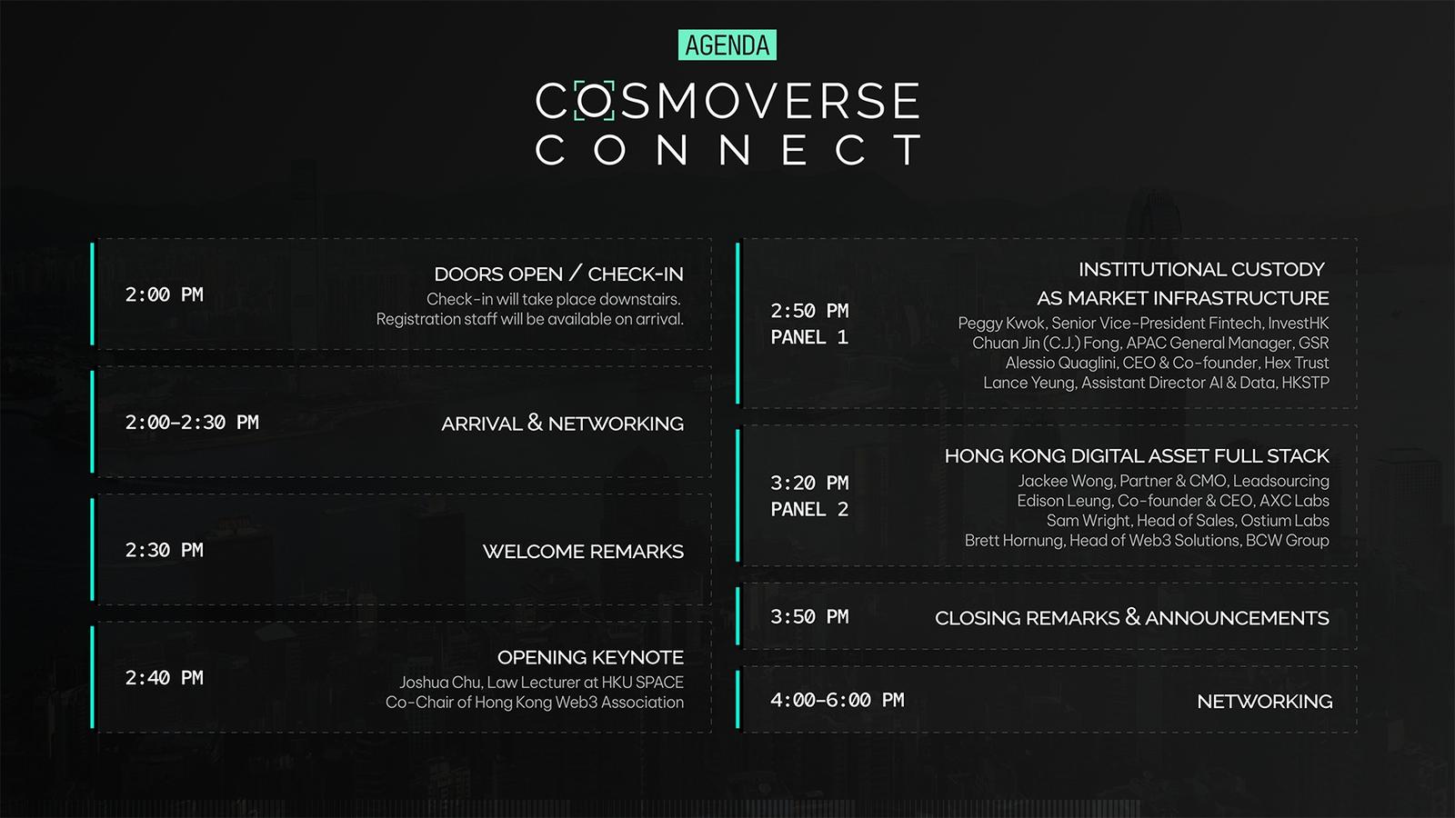 Hosted at Soho House Hong Kong, one day before Consensus Hong Kong with 15,000+ global attendees in town, Cosmoverse Connect serves as a high-signal kickoff to Hong Kong Blockchain Week and a focused forum for senior stakeholders operating at the intersection of infrastructure and institutional capital.