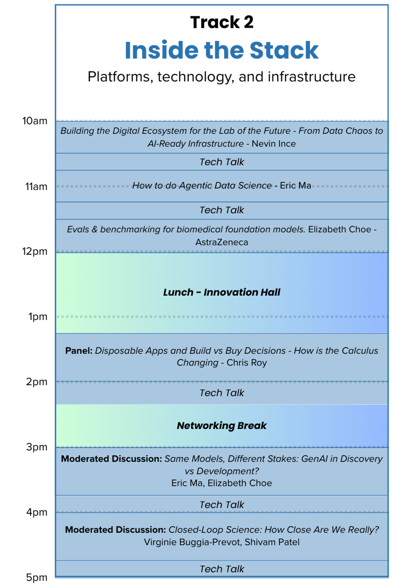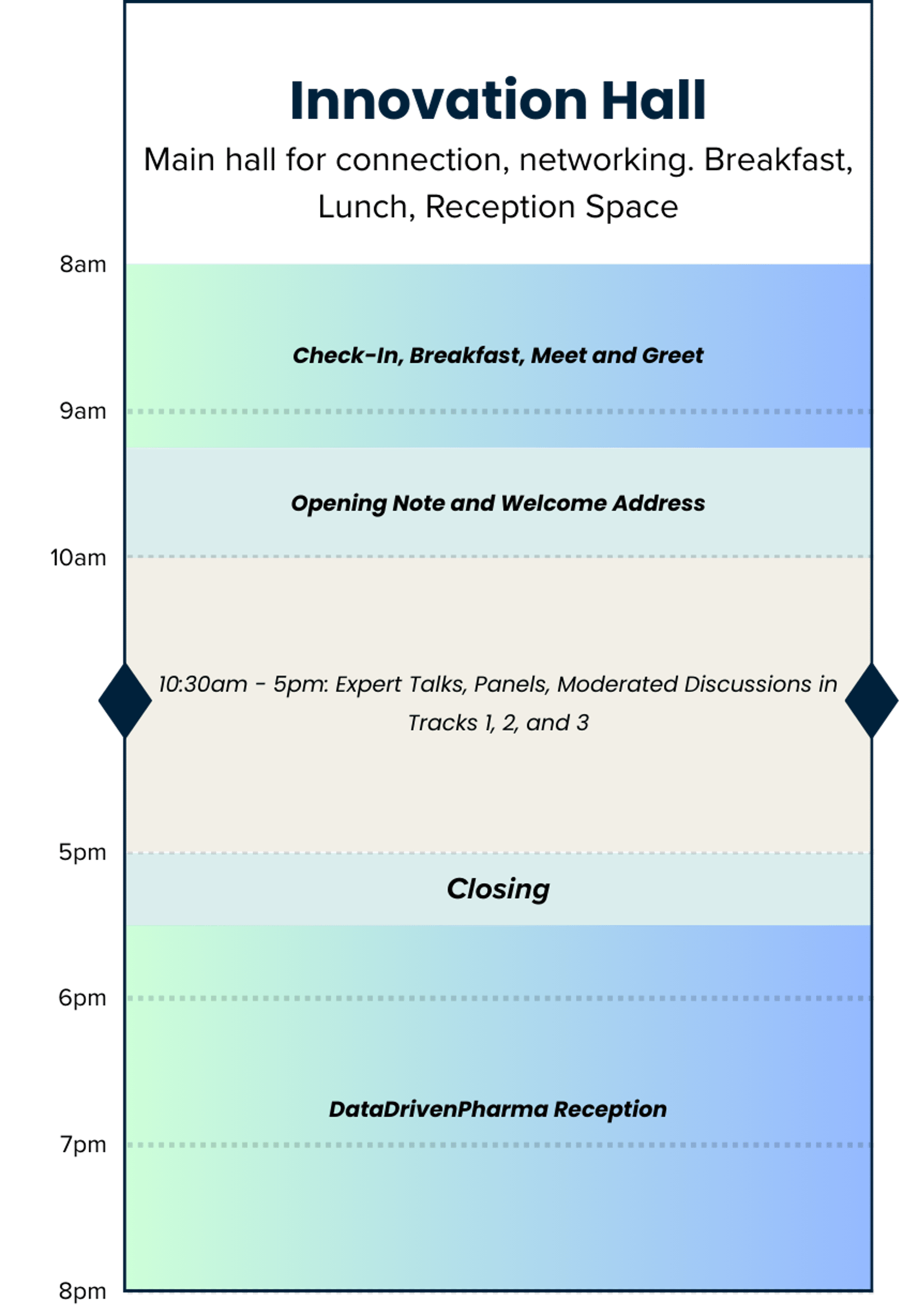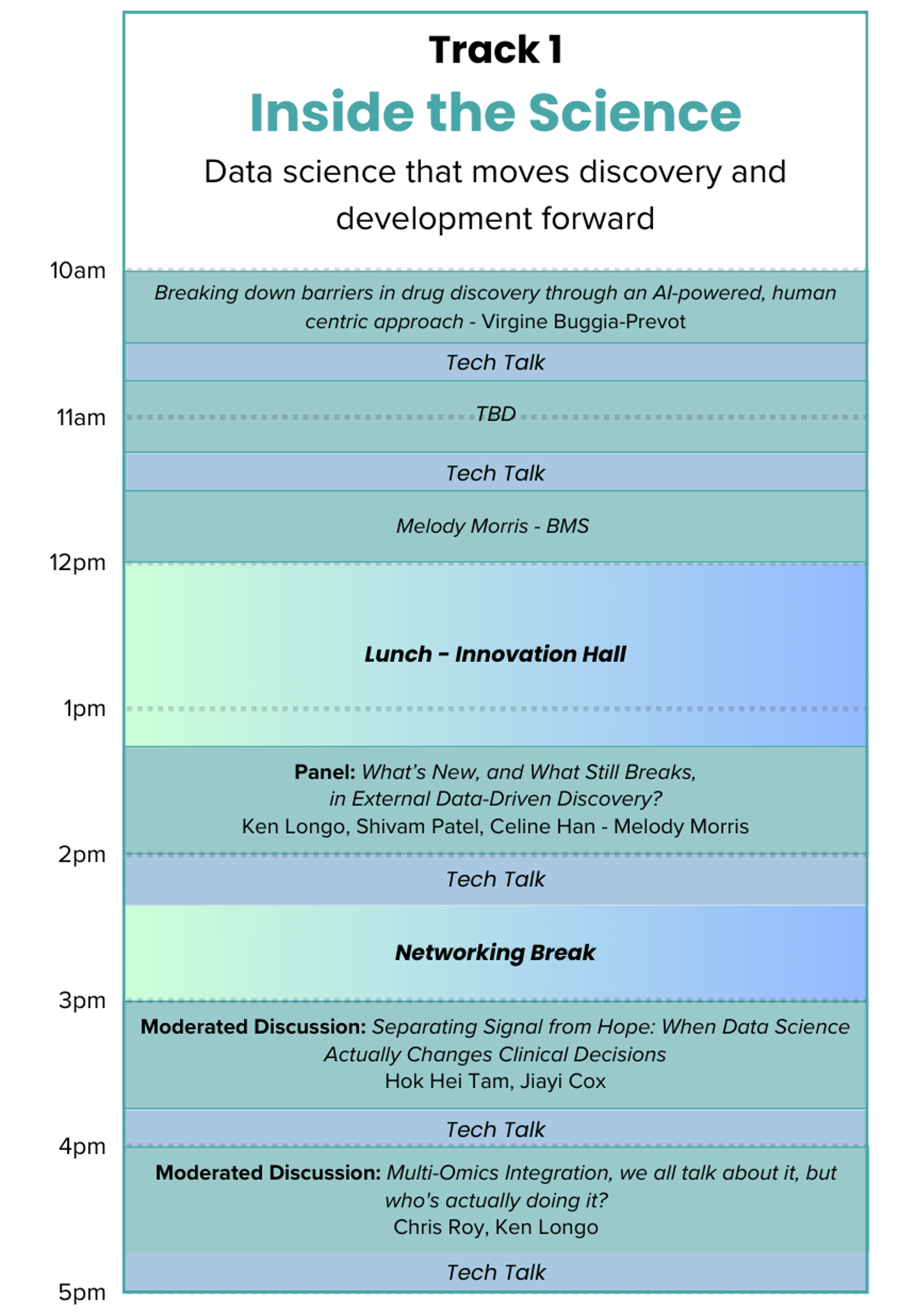 We believe that content and human connection are equally important in a conference experience, and we thoughtfully design our agenda to reflect this philosophy. The day starts with presentations and stories from data leaders in pharma and biotech, transitions to a panel block, and concludes with moderated roundtable discussions where everyone has a chance to engage. We also provide multiple unstructured networking breaks and a reception, with total networking opportunities in excess of 5 hours.