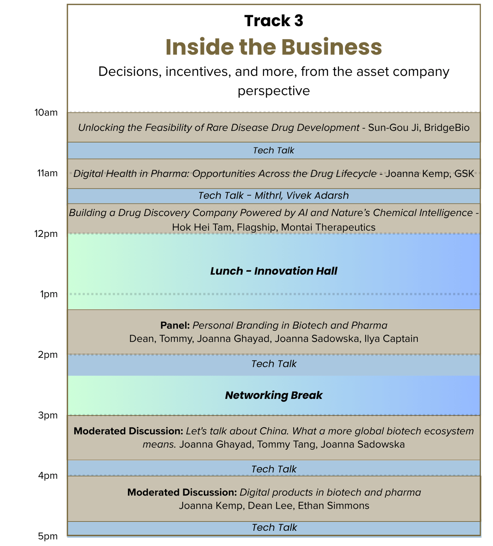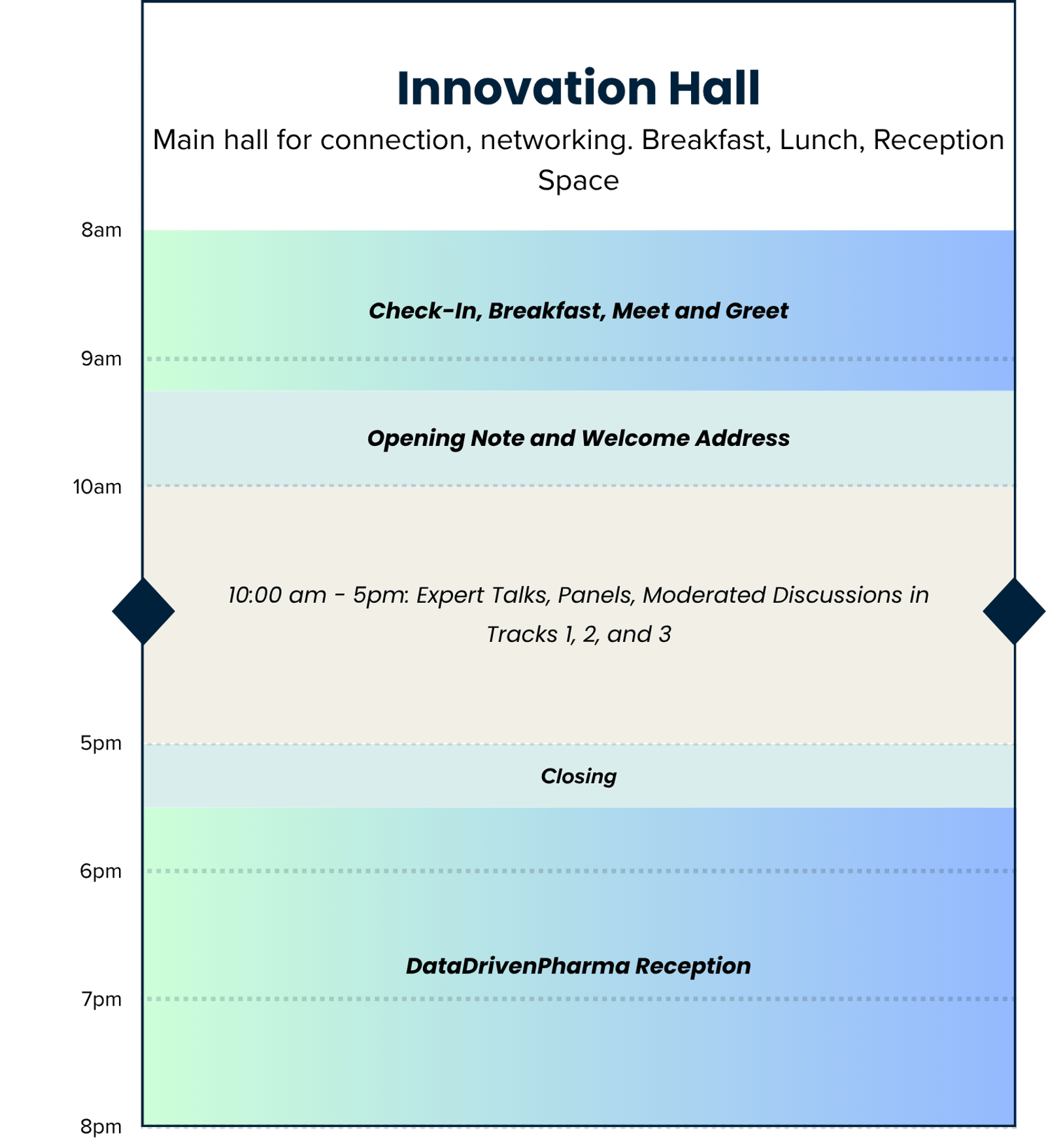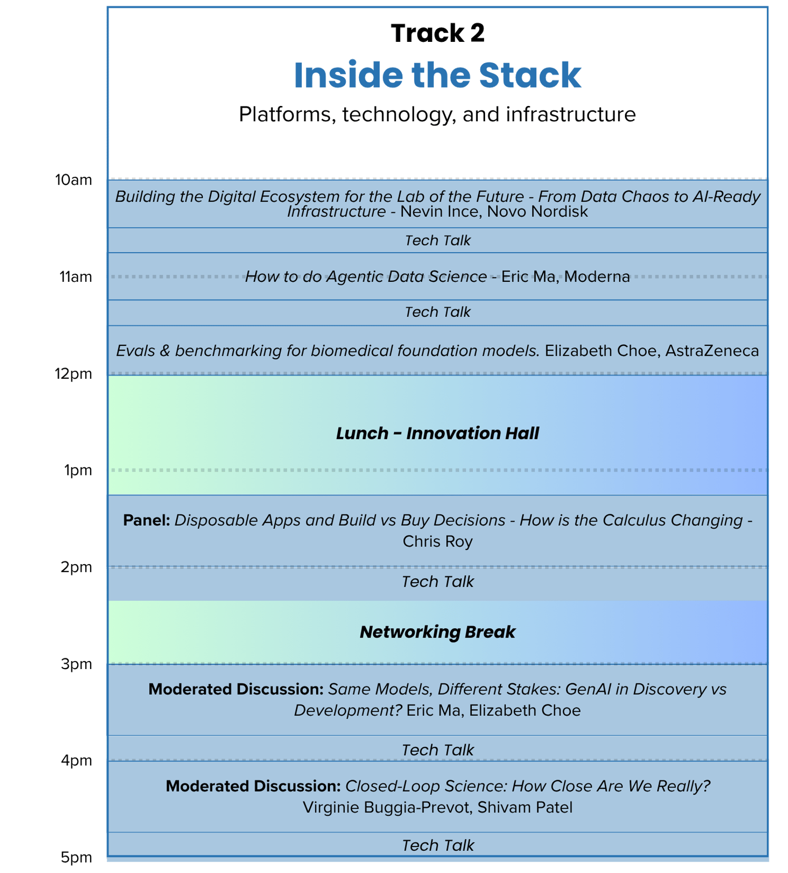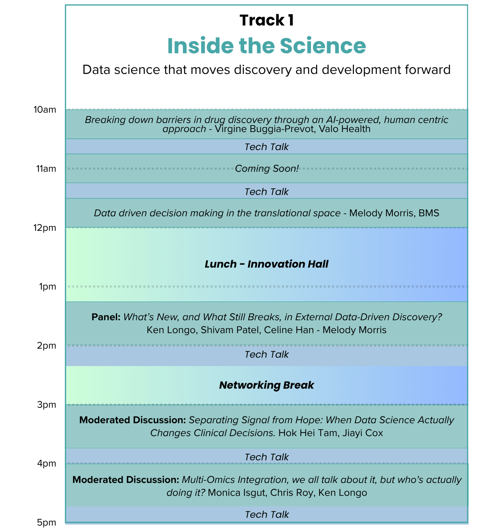 We believe that content and human connection are equally important in a conference experience, and we thoughtfully design our agenda to reflect this philosophy. The day starts with presentations and stories from data leaders in pharma and biotech, transitions to a panel block, and concludes with moderated roundtable discussions where everyone has a chance to engage. We also provide multiple unstructured networking breaks and a reception, with total networking opportunities in excess of 5 hours.