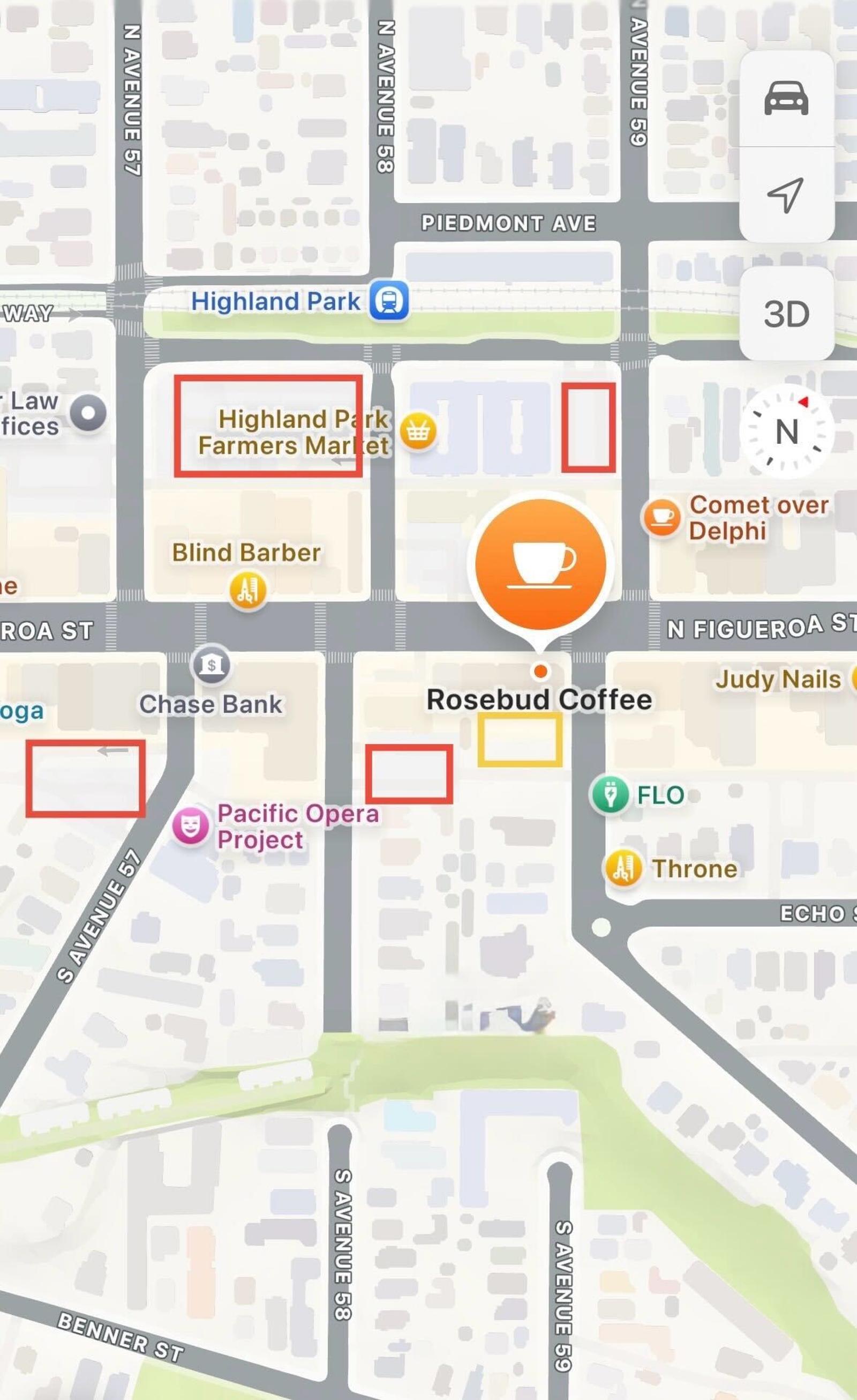 Please see the map below for parking. The yellow box indicates Rosebud's limited free parking behind our coffee shop, off of Avenue 59. The red boxes indicate metered lots off of Figueroa, walking distance from our shop.