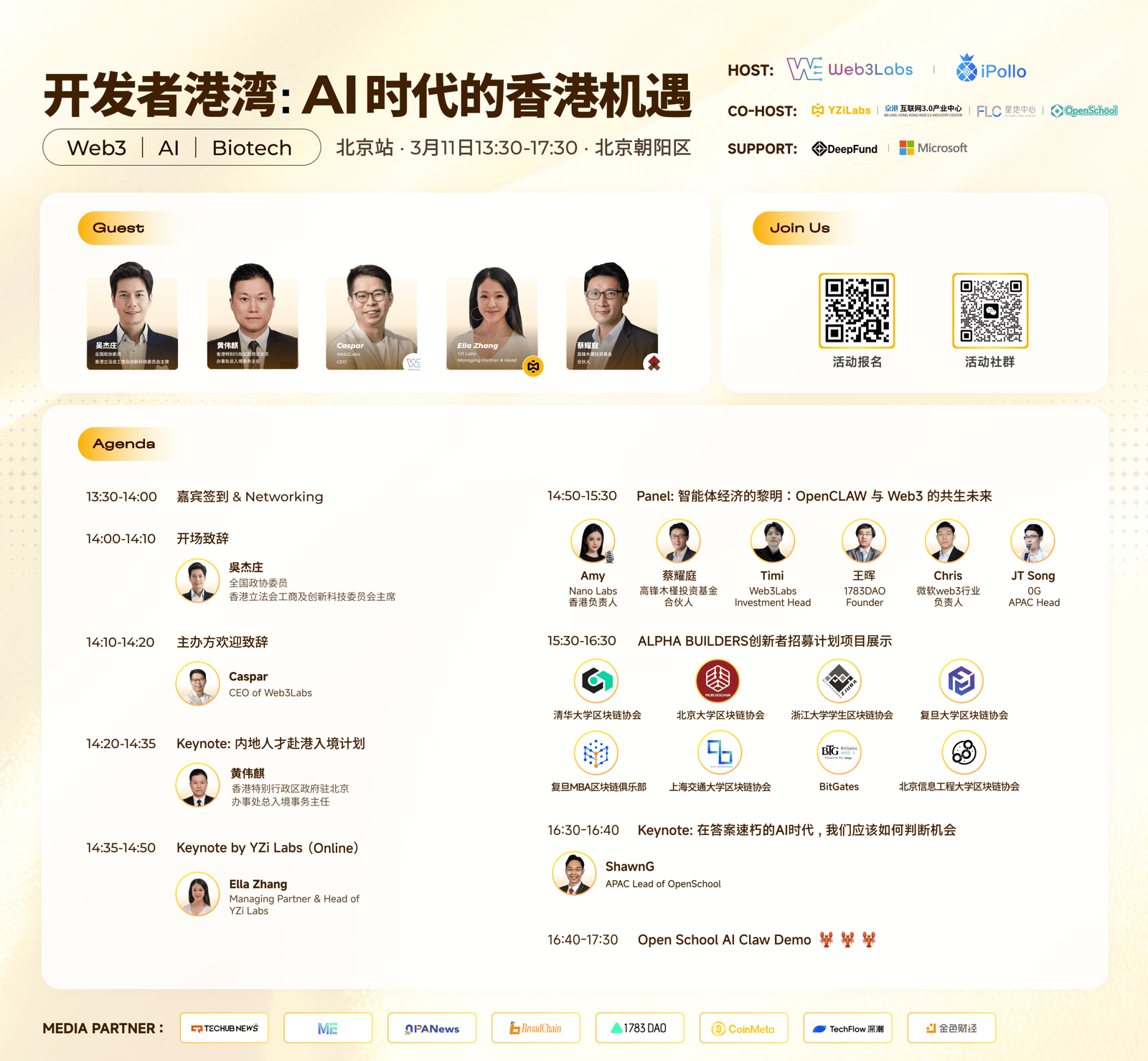 在 AI、Web3、 Biotech 融合爆发的临界点,早期技术的突破往往源于那些最硬核的“构建者”。为此,Web3Labs携手YZi Labs特别发起「Alpha Builders创新者招募计划」并于3月11日在北京进行线下展示日。
